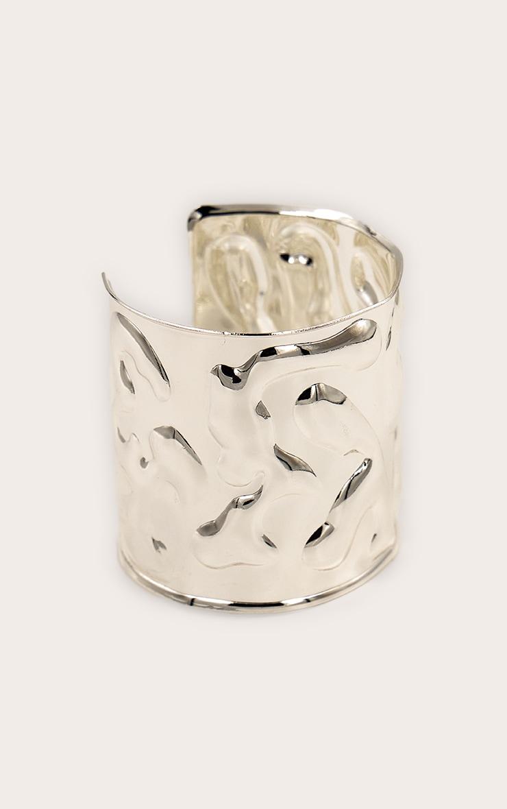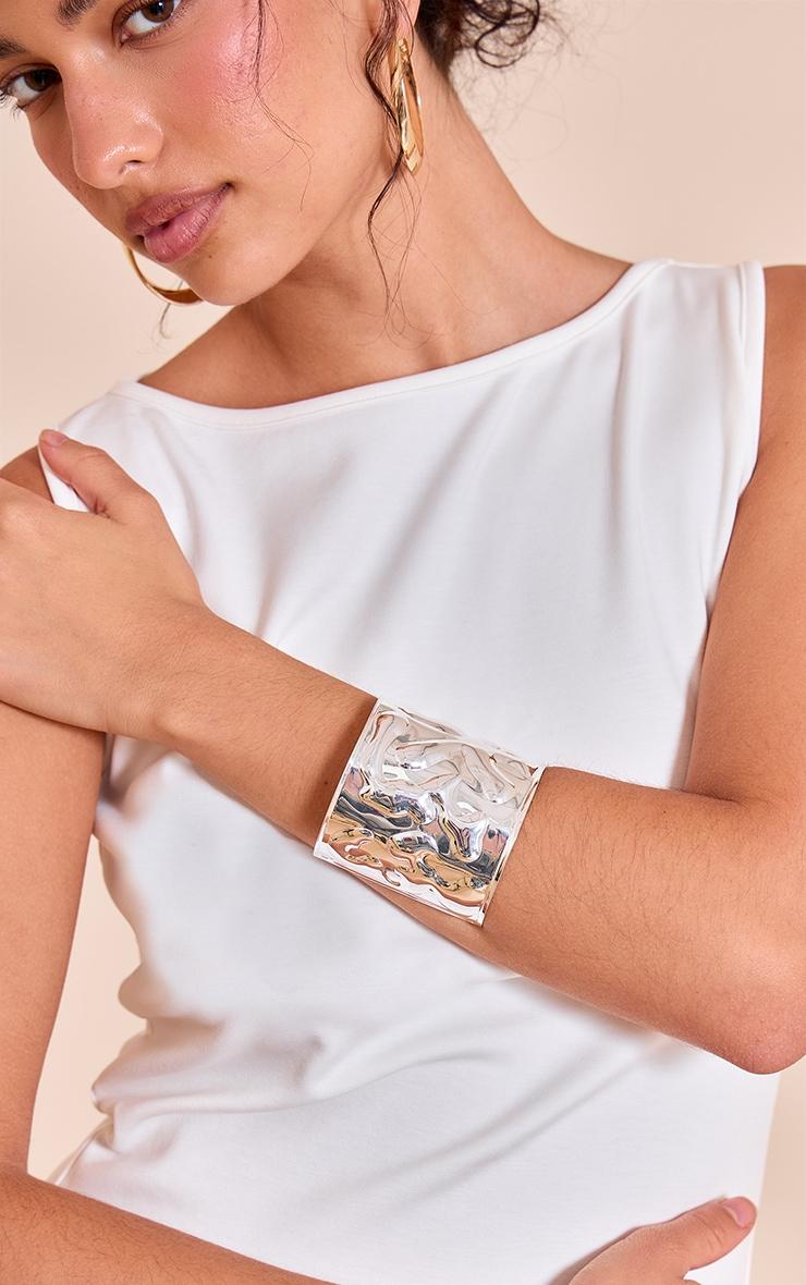 Draw the eye with an artful flourish. The silver hammered symmetrical cuff commands attention with its wide, sculptural form and distinctive textured surface that effortlessly catches the light. This bold piece wraps the wrist with a confident presence, defining your evening aesthetic. Pair it with a minimalist slip dress or a sharp tailored jumpsuit; it's the defining element that sets your look apart.p]:!mb-4inch>Brand: PrettyLittleThingCategory: AccessoriesProduct type: BraceletColor: SilverMaterial: MetalOccasion: Evening