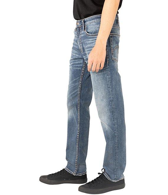 From Silver Jeans Co., these jeans feature: Performance stretch denim with ultimate flexibility and mobility Distressed medium-dark indigo wash with thick contrast stitching Athletic fit Modern tapered leg Belt loops Zip fly/button closure 5-pocket styling Contrast stitching on the back pocket Approx. 15.5" leg opening Cotton/elastane Machine wash Imported.