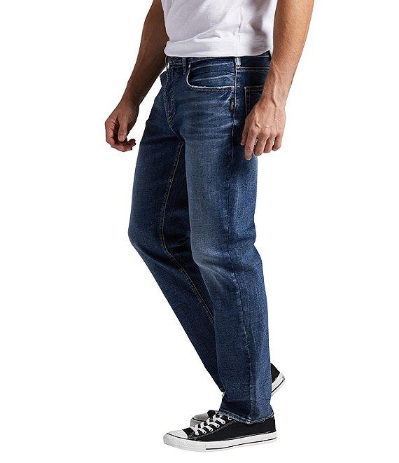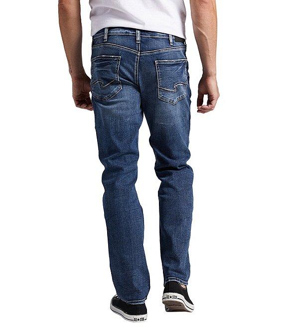 From Silver Jeans Co., these jeans feature: Athletic fit in the hips and thighs Mid rise waist Belt loops Zippered fly with button closure Two front pockets; one with coin pocket Two back pockets Tapered legs 5-pocket styling 15" leg openings Cotton/polyester/elastane denim Machine wash/tumble dry Imported.