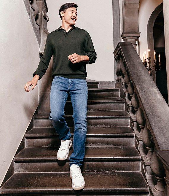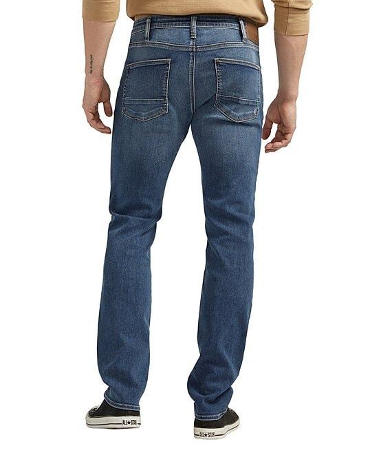 From Silver Jeans Co., these jeans feature: Slim fit Straight legs Sits below the waist Medium indigo wash Belt loops Hip and thigh 15.25 back rise Max Flex denim with the highest amount of stretch for superior flexibility 5-pocket styling Zip fly and button closure 14 leg opening Cotton/lyocell/polyester/elastane Machine wash/tumble dry Imported.