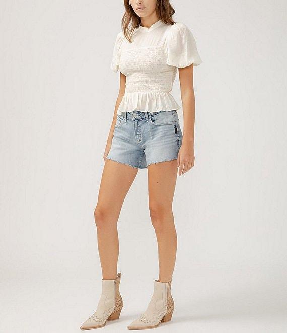 From Silver Jeans Co., these shorts feature:DenimMid riseCurvy fit5-pocket stylingZip fly, button closure, and raw hemlineMachine washable/tumble dryCotton/elastane/polyesterImported.