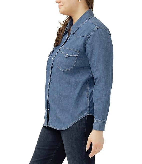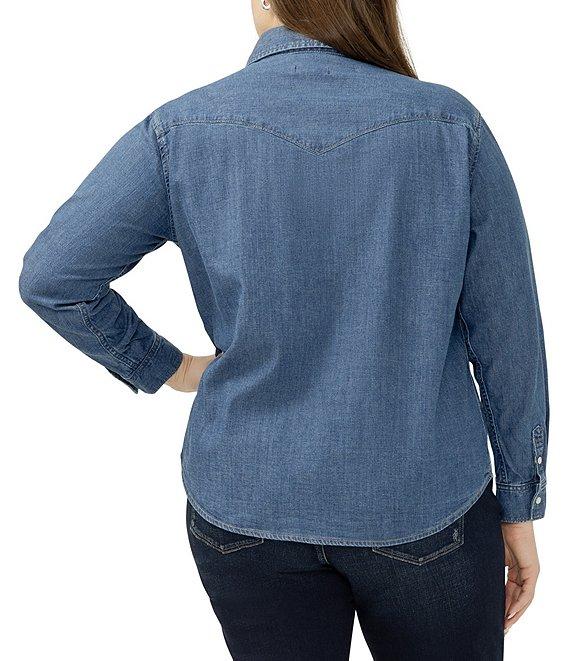 From Silver Jeans Co. Plus, this shirt features: Denim fabrication Medium indigo wash Point collar Long sleeves Front chest pockets Shaped hem Center front snap-button closure Cotton/polyester Machine wash Imported. Lean into the classics with a denim shirt featuring western-inspired details like pointed seams, snap buttons and flap pockets. Layer it or let it stand alone, this is a piece you can repeat and remix year-round. Button-down denim shirt in a medium indigo wash back rise Low Stretch denim that looks authentic with added stretch for comfort.