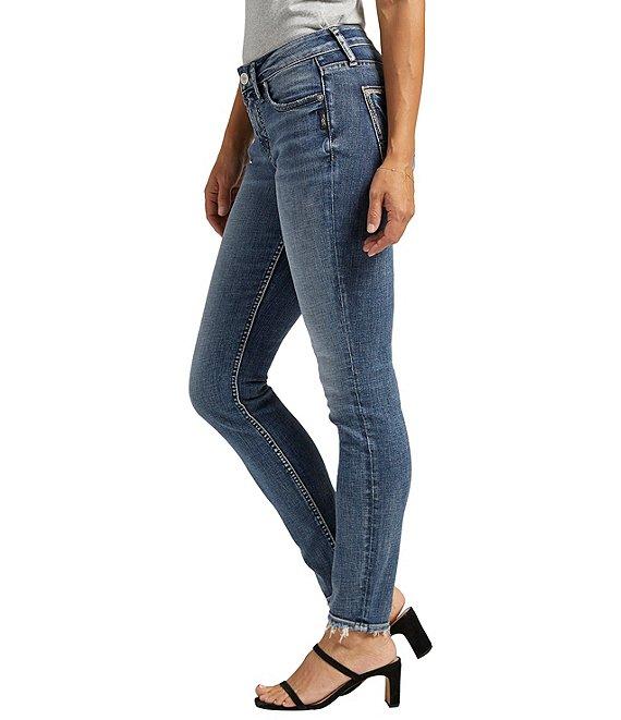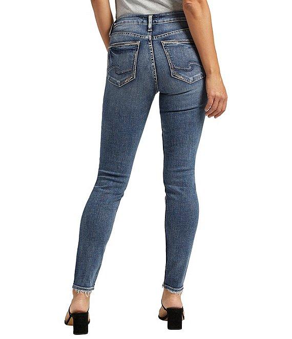 From Silver Jeans Co., these jeans feature: Mid rise Zip/button-front closure Belt loops 5-pocket styling 2 front pockets (1 with coin pocket) 2 back pockets Full length Skinny legs Power stretch denim with highest stretch and recovery Cotton/polyester/elastane Machine wash/tumble dry Imported.