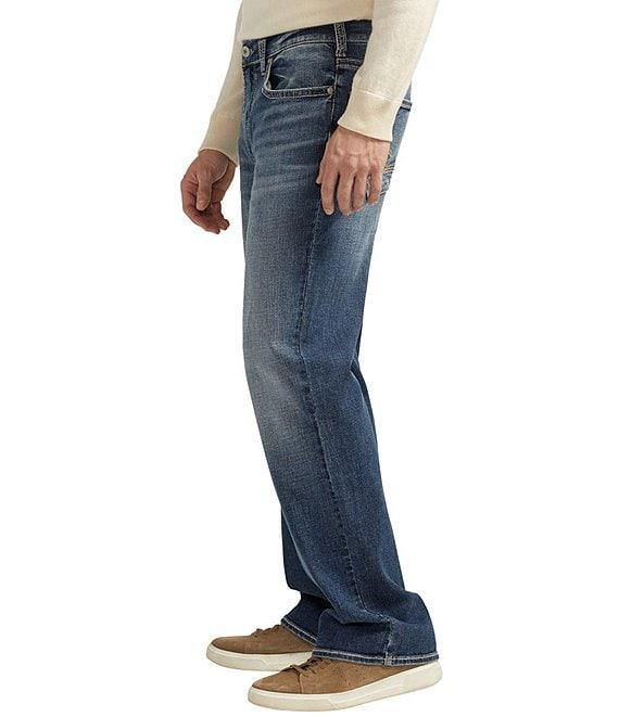 From Silver Jeans Co., these jeans feature: Casual, relaxed fit Straight legs 5-pocket styling Sits just below the waist Relaxed fit through the hips and thighs 19” leg openings Zip/button closure Belt loops Engineered with innovative stretch technology Cotton/recycled polyester/recycled cotton denim Machine wash/tumble dry Imported.