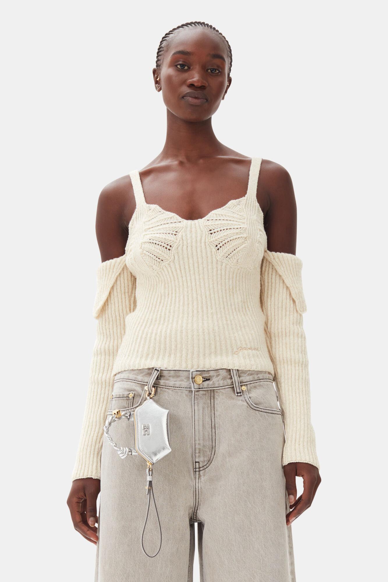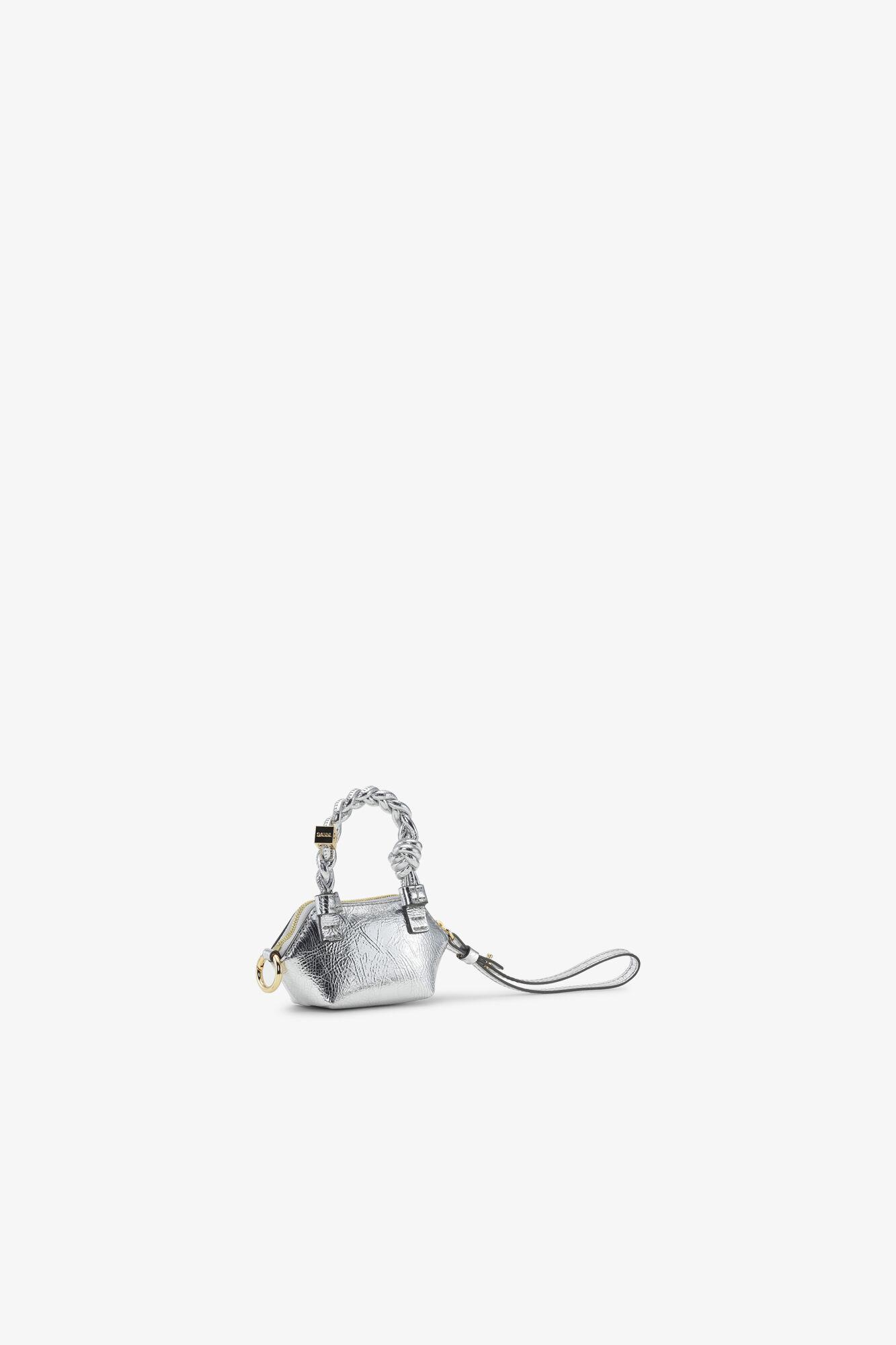 This Silver Metallic Nano GANNI Bou Bag features a tone-on-tone metallic GANNI Butterfly logo, a twisted handle with a braided knot, and a gold-tone metallic dice with a GANNI Butterfly logo engraved. The bag has a zipper closure at the top and a removable wrist strap. The bag is suitable for small essentials like keys, coins, or lip balm.