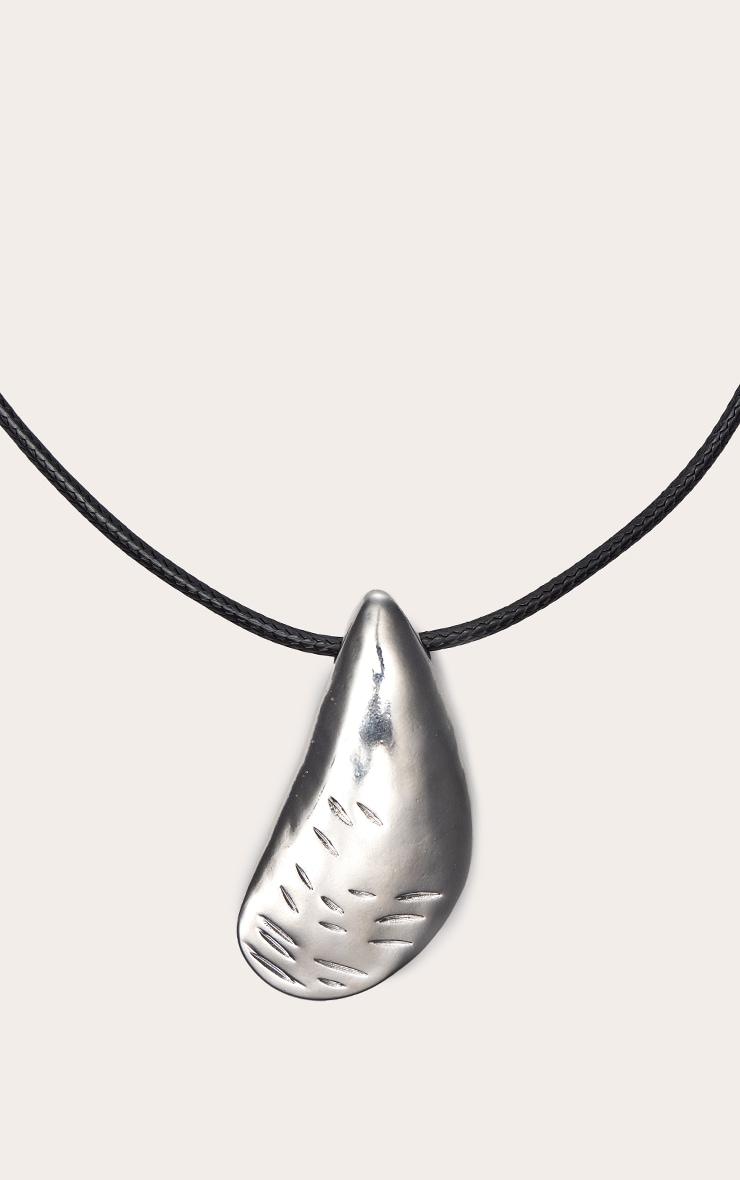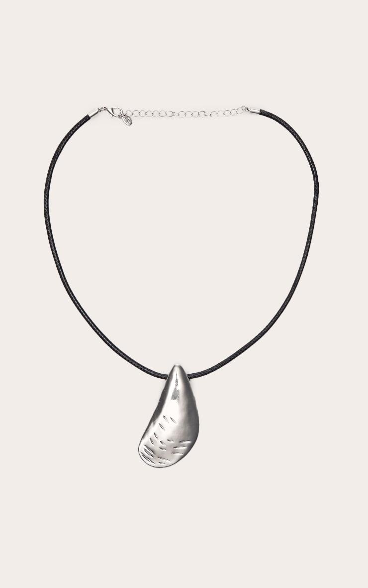 Adorn your neckline with the artful silver oyster shape oversized cord necklace. This striking accessory showcases a distinct silver oyster shape pendant, suspended from a slender black cord. This piece is poised to elevate your after-dark aesthetic for those unforgettable evenings. Complete your look with a structured bandeau top, sleek black heels, and complementary drop earrings for a self-assured finish.p]:!mb-4inch>Category: AccessoriesProduct type: NecklaceColor: SilverMaterial: MetalOccasion: Evening