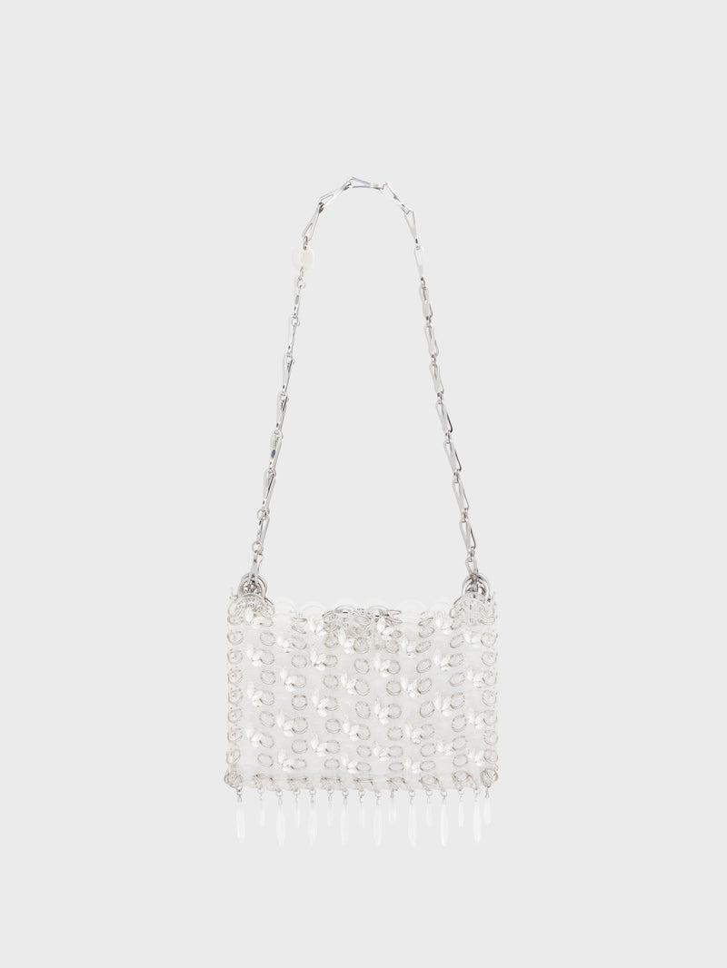 Color : Transparent / Silver Embellished with crystal strass forming transparent drops. Wear : over the shoulder Rabanne engraved magnetic closure