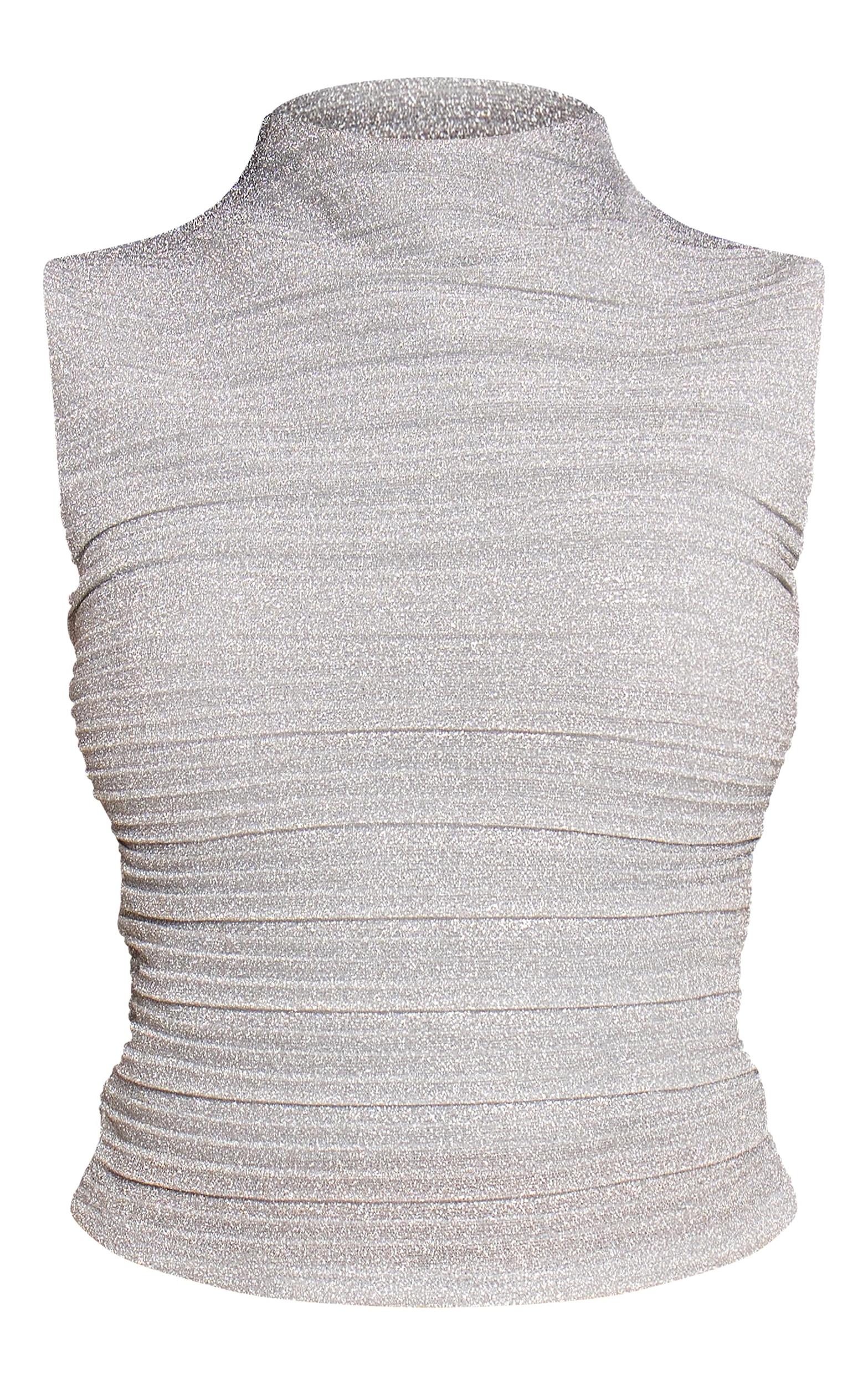 Step into the evening with unmistakable shimmer. This silver textured glitter high neck top is crafted for making a confident statement, featuring a sleek sleeveless cut and an artful high neckline, elevated by subtle ruching on the sides that defines its cropped silhouette. Pair it with its matching mini skirt for a cohesive two piece set vision, or introduce a sharp contrast with high-waisted tailored pants. Complete your elevated aesthetic with sharp pointed toe heels and a refined gold ring, ensuring you own every moment after dark.Length approx 48.5cm/19inch (Based on sample size US 4)Model wears size UK 8/ EU 36/ AUS 8/ US 4Model Height - 5ft 6inchp]:!mb-4inch>Brand: PrettyLittleThingCategory: Co-ordsProduct type: Vest TopColor: SilverMaterial: Glitter KnitOccasion: Evening
