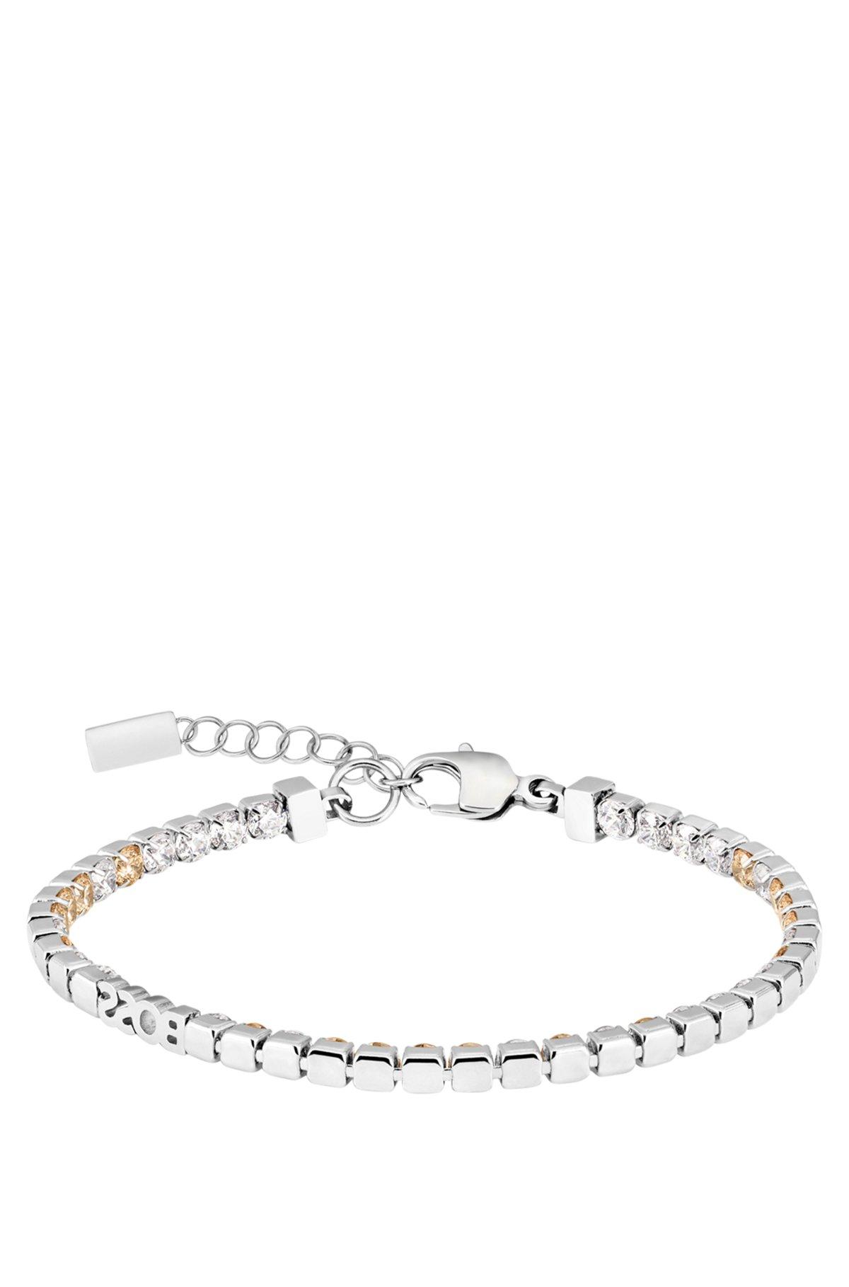 Trimmed with sparkling crystals in clear and champagne effects, this tennis bracelet by BOSS Jewelry is something truly special. Adjustable extender. Integrated logo lettering. Length: 16cm (with extender)