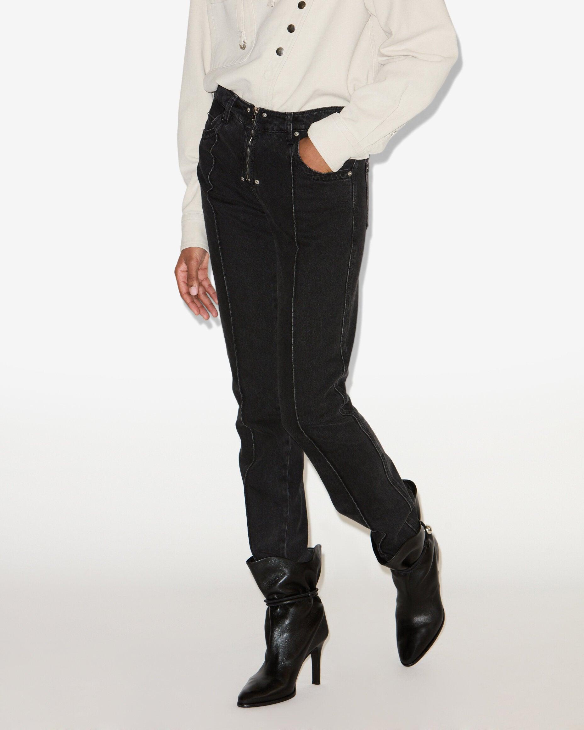 Straight-leg denim jeansFitted waistband with loopsDone up with a visible zipper 5 classic pocketsRibbed front and contrasting topstitchesLeather label in back with an embossed "Isabel Marant" logoMetal rivetsMedium-rise waistStyle: PA0606FA-C4H01I SILVIANA