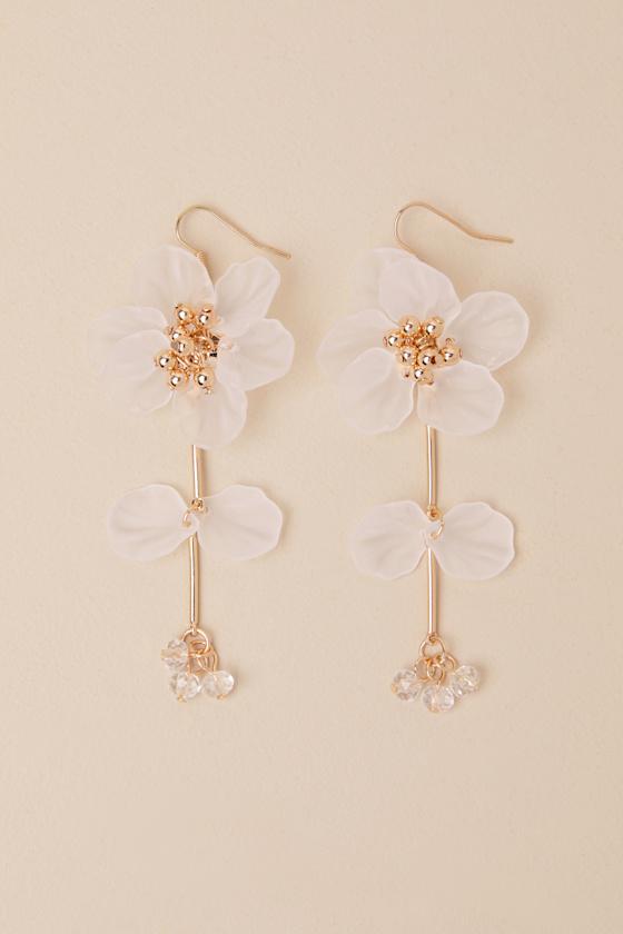 The Lulus Simple Decadence White and Gold Flower Drop Earrings can be added to any formal occasion look to elevate its elegance! These fabulous earrings have a drop-style silhouette, which includes frosted acrylic flowers at the posts and petal-like accents throughout. Shiny gold beads embellish the center of the flowers, while a trio of clear beads dangles from the bottom of the shoulder-skimming lengths.