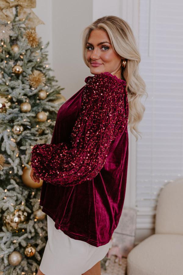 - Let your inner sparkle show with this fabulous top! - Unlined velvet material - A ruffled v-cut neckline - A faux buttoned front with accent buttons - Long, loose sequins sleeves with elastic cuffs - A relaxed silhouette that ends in a straight hemline