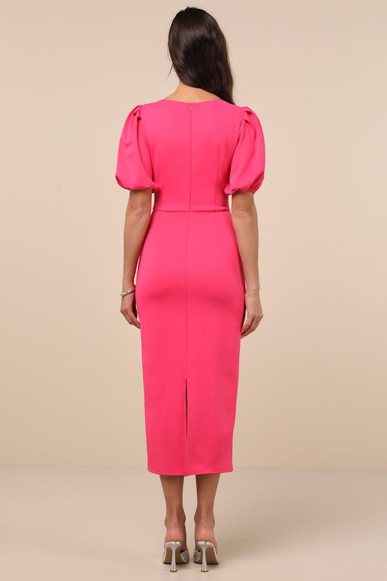 If you love a stylishly sophisticated look, the Lulus Simply Beloved Fuchsia Puff Sleeve Bodycon Midi Dress will always be your best pick! Sleek and ultra-flattering ponte knit shapes this chic dress that features a classic boat neckline, a princess-seamed bodice, and trendy puff sleeves with gathering at the shoulders and elastic at the cuffs. The fitted waist sits atop a classic bodycon skirt that finishes with a modern midi hem. Convenient kick pleat at the back. Hidden back zipper/clasp.
