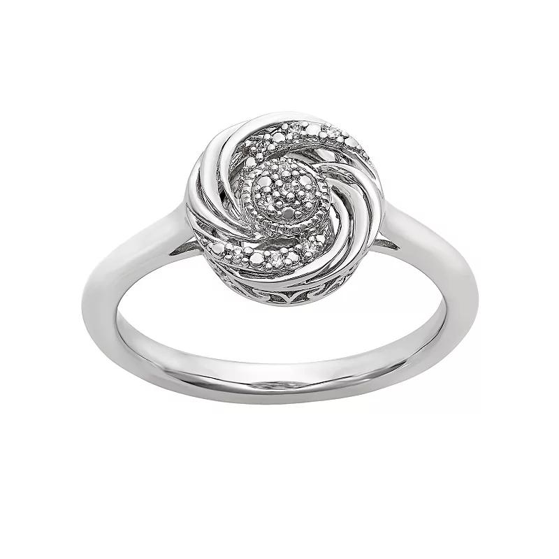 Add fashionable flair to your ensemble when you don this eye-catching diamond accent swirl ring.RING DETAILSWidth: 10 mmMetal: rhodium-plated sterling silverFeatures: milgrain details, open-worked sidesDIAMOND DETAILSTotal weight: less than 1/10 ct.Shape: single cutColor grade: I-JClarity: I3Setting: prongImage(s) may be enlarged to show detail.Diamond weights are approximate. Diamond total weights may vary between .01 and .08 ct. Some diamonds have fewer than 17 facets.Gemstones may have been treated to enhance their appearance. Special care may be required. Please visit our Gemstone Treatment & Special Care Guide for more information. Size: 6. Color: White. Gender: female. Age Group: adult.