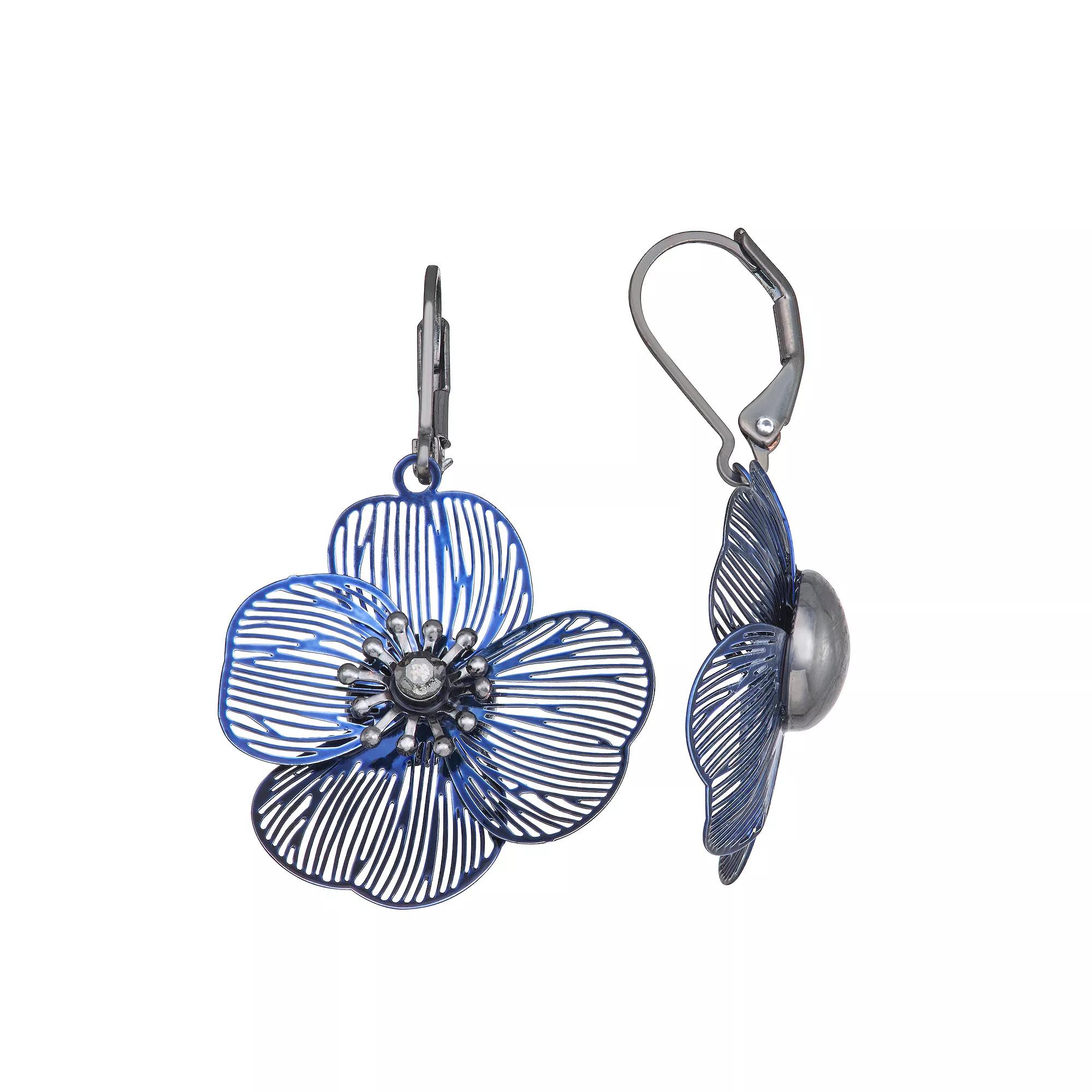 Accessorize in style with these Simply Vera Vera Wang leverback small flower drop earrings. Accessorize in style with these Simply Vera Vera Wang leverback small flower drop earrings. FEATURES Length: 40 mm Backings: leverback Nickel safe Material: 20% steel, 20% recycled zinc, 5% glass, 55% recycled brass Plating: black, silver tone Finish: polishedSUSTAINABILITY FEATURES Contains at least 50% recycled metal Global Recycled Standard Certified Not appropriate for children 14 years old and younger. Size: One Size. Color: Blue. Gender: female. Age Group: adult.