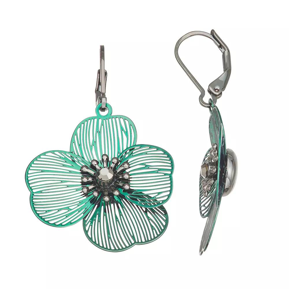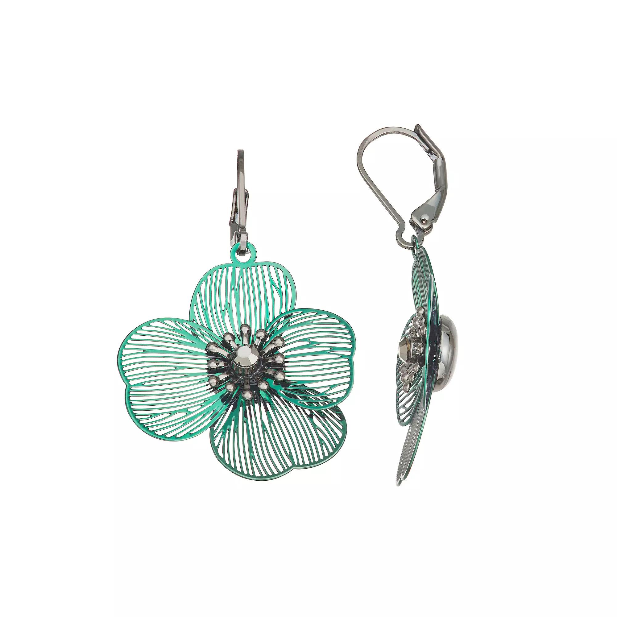 Accessorize in style with these Simply Vera Vera Wang leverback small flower drop earrings. Accessorize in style with these Simply Vera Vera Wang leverback small flower drop earrings. FEATURES Length: 40 mm Backings: leverback Nickel safe Material: 20% steel, 20% recycled zinc, 5% glass, 55% recycled brass Plating: black, silver tone Finish: polishedSUSTAINABILITY FEATURES Contains at least 50% recycled metal Global Recycled Standard Certified Not appropriate for children 14 years old and younger. Size: One Size. Color: Green. Gender: female. Age Group: adult.