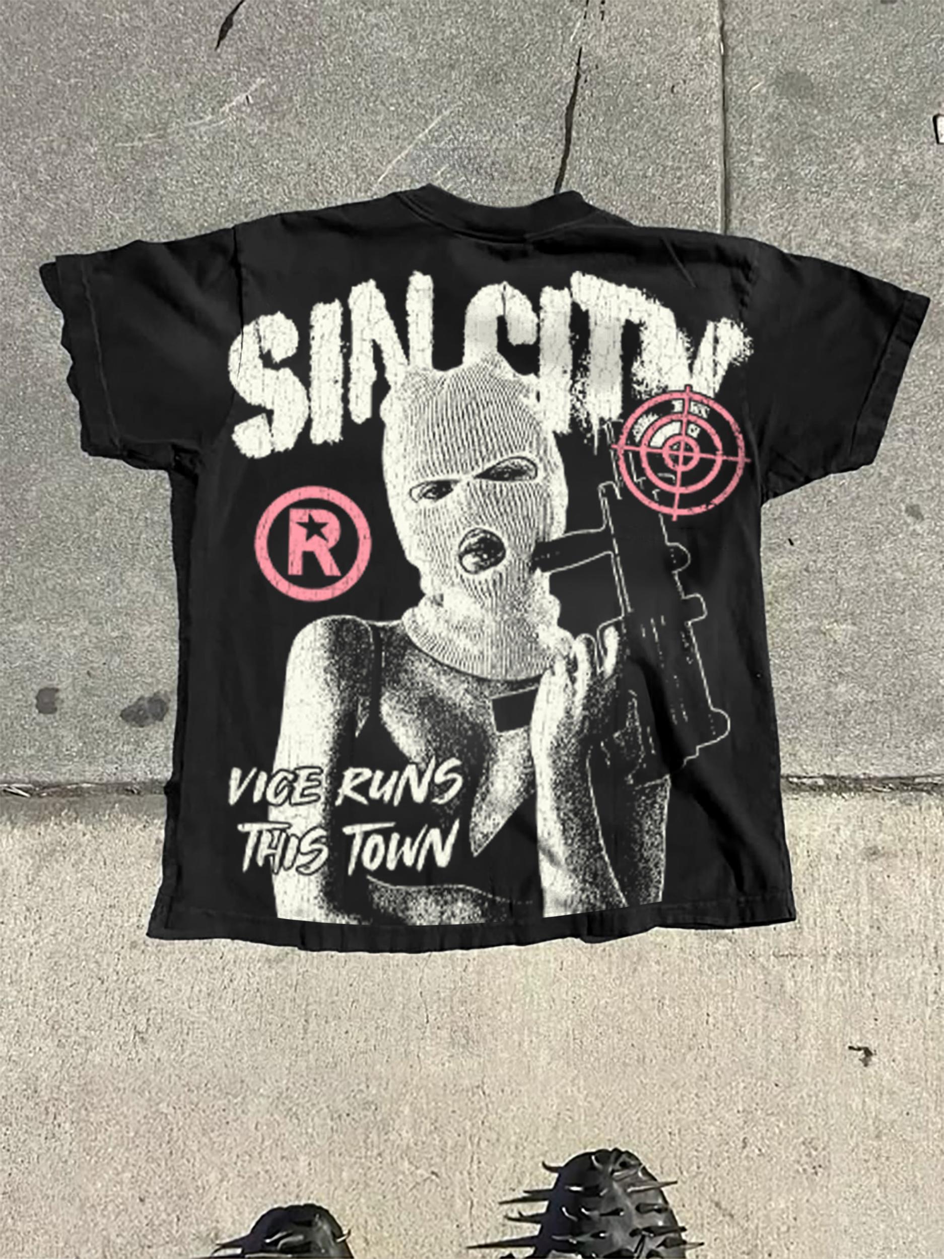 Sin City Vice Runs This Town Gangster Streets Vintage Graphic Oversized Cotton T-shirt. SPU: CP-232757-WJY Fabric: 100% Cotton Fabric Weight: 230g Pattern: Gangster Streets Graphic Fit: Oversized Fit Gender: Women,Men Season: Summer Size Range: S-3XL Color: Black,White Print Position: Back