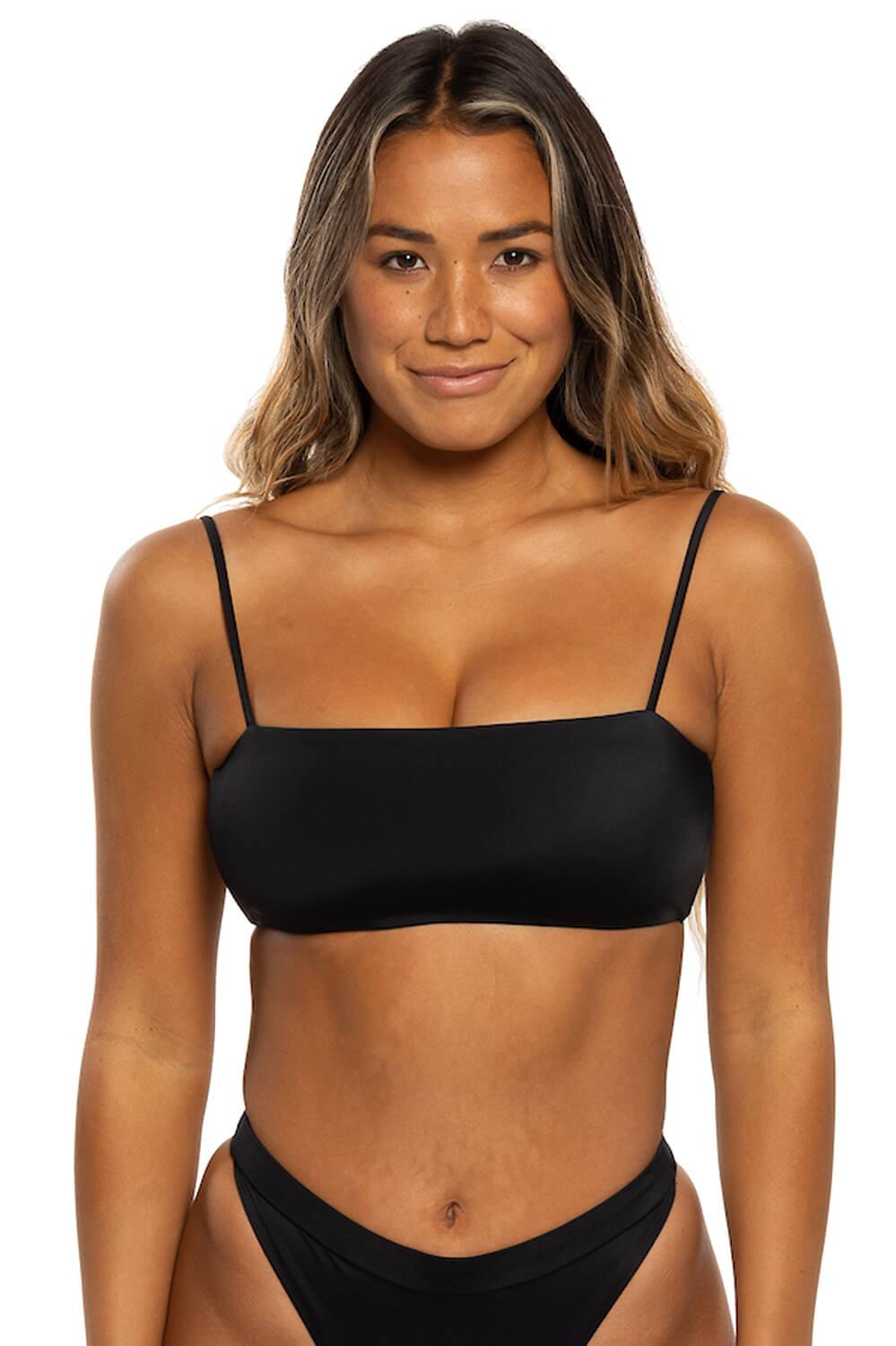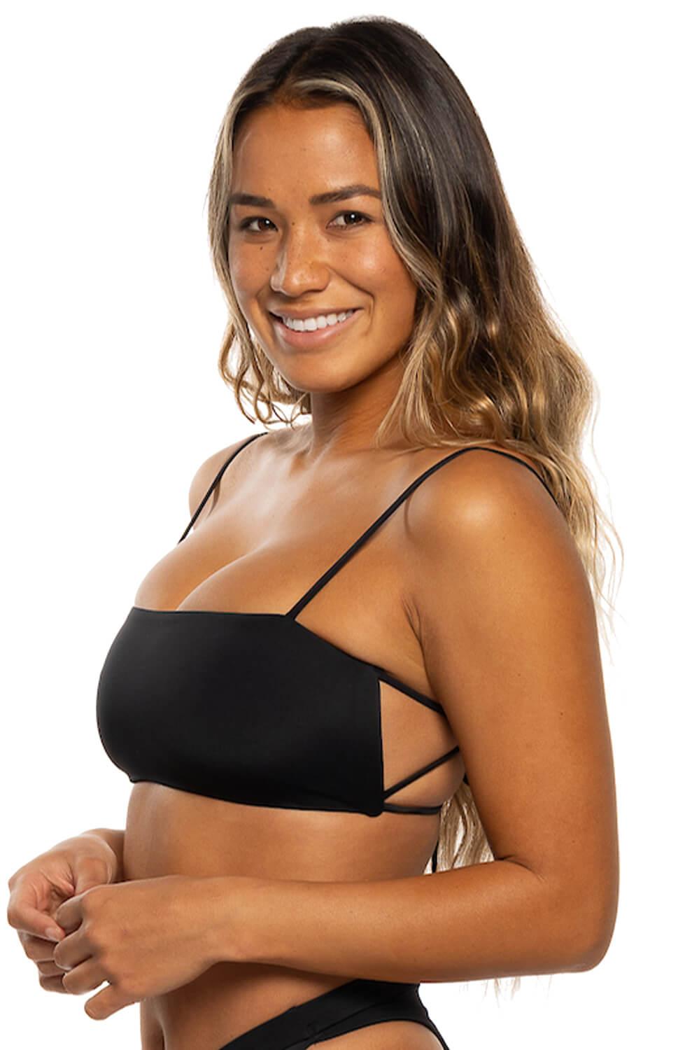 FINAL SALEThe Sina bikini top has a gorgeous bandeau style front with tie straps - perfect for longboarding, paddling, or hanging at the beach. Part of the JOLYN x Eryn Krouse Collection, the Sina features one of a kind geometric cut out straps and boning under the arm for optimal support and structure. Surf from sunrise to sunset and feel fully supported all day with the Sina's silky smooth Recycled Sea-Flex fabric."I think the cut-out details in the sides of the top with the criss-cross strapping are so feminine, yet still supportive enough to be active while wearing it." Features: Eryn Krouse x JOLYN Good for: surfing, longboarding, paddling, lifestyle Bandeau tie-back Fixed shoulder straps and adjustable straps around the ribcage Lined + unpadded Low impact Tagless for maximum comfort True to size Fit Tip: Underarm boning for structure and support.Straps on XS, S, M, - 1/4" spaghetti strapStraps on L, XL - 5/16" spaghetti strap Fabric Composition: Recycled Sea-Flex fabric Shell: 78% Recycled Nylon 22% Elastane Liner: 78% Recycled Nylon 22% Elastane Care Instructions: Hand wash cold Hang dry Do not iron, dry clean or bleach