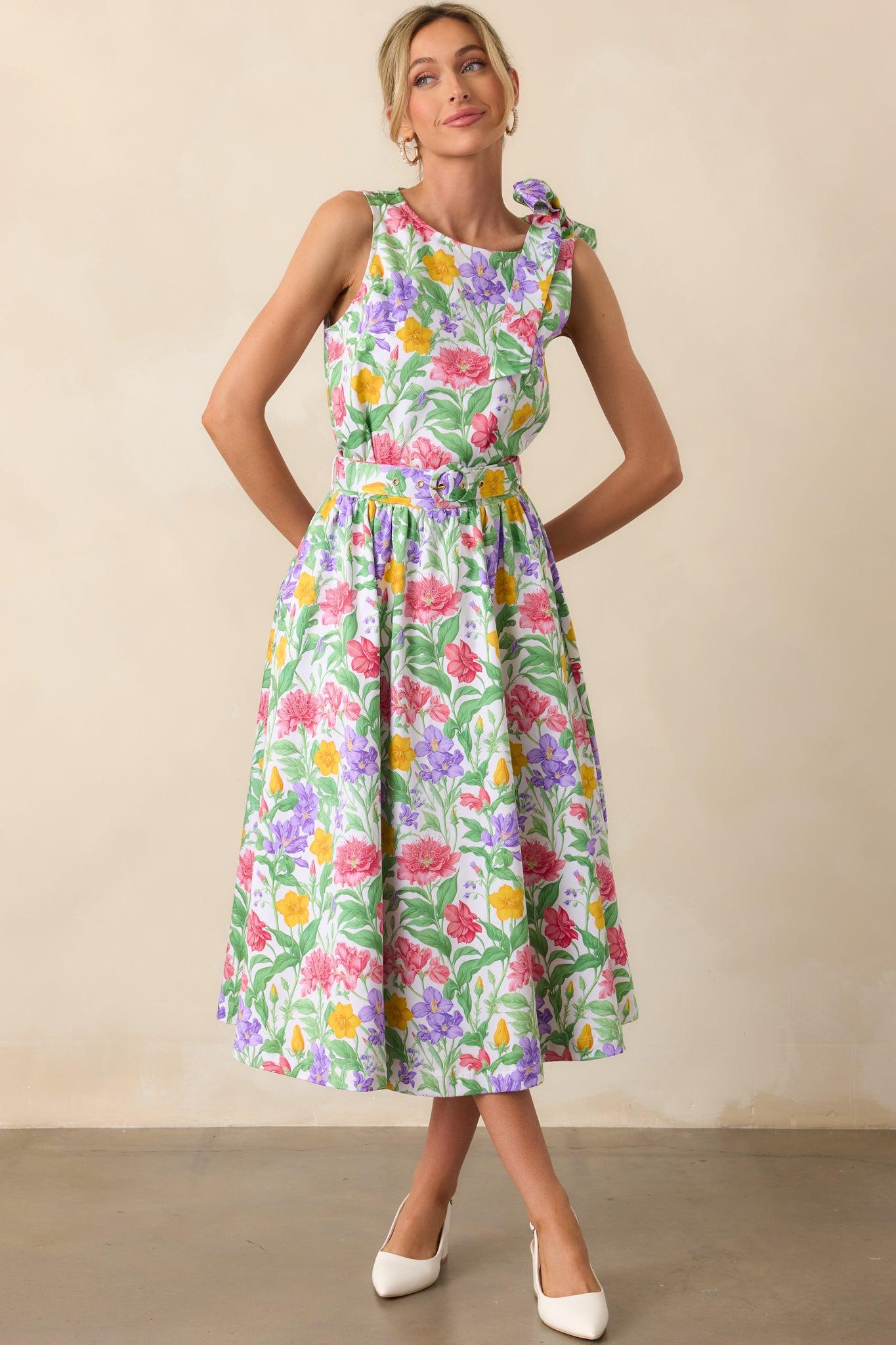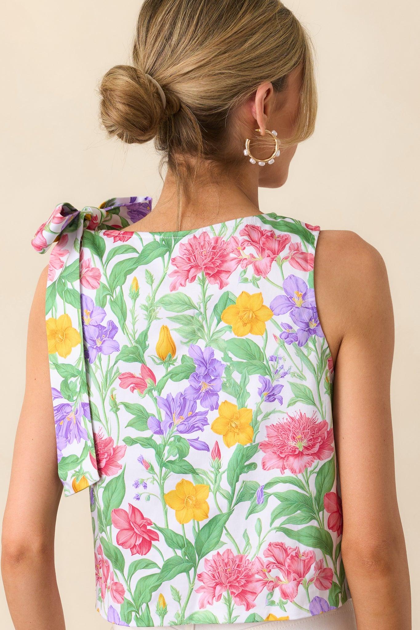 The Sinclair Garden Party Floral Cotton Top is a delightful choice for embracing effortless style. Its versatile design makes it ideal for casual gatherings or special occasions, adding a touch of charm to any outfit. This top features a Prosperina exclusive floral print, round neckline, cropped length, sleeveless design, and a self-tie bow shoulder.