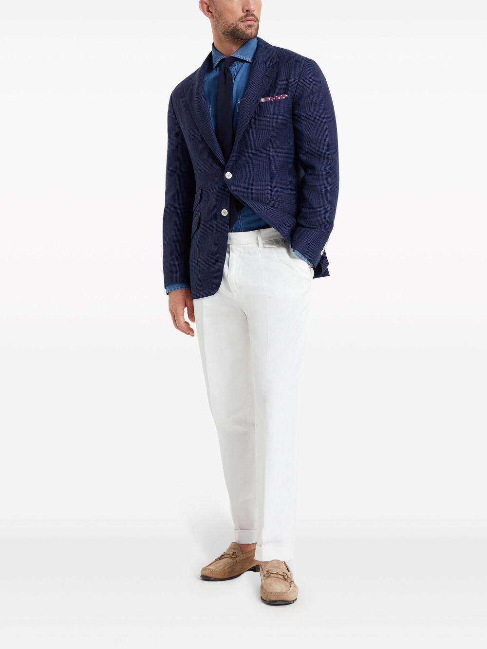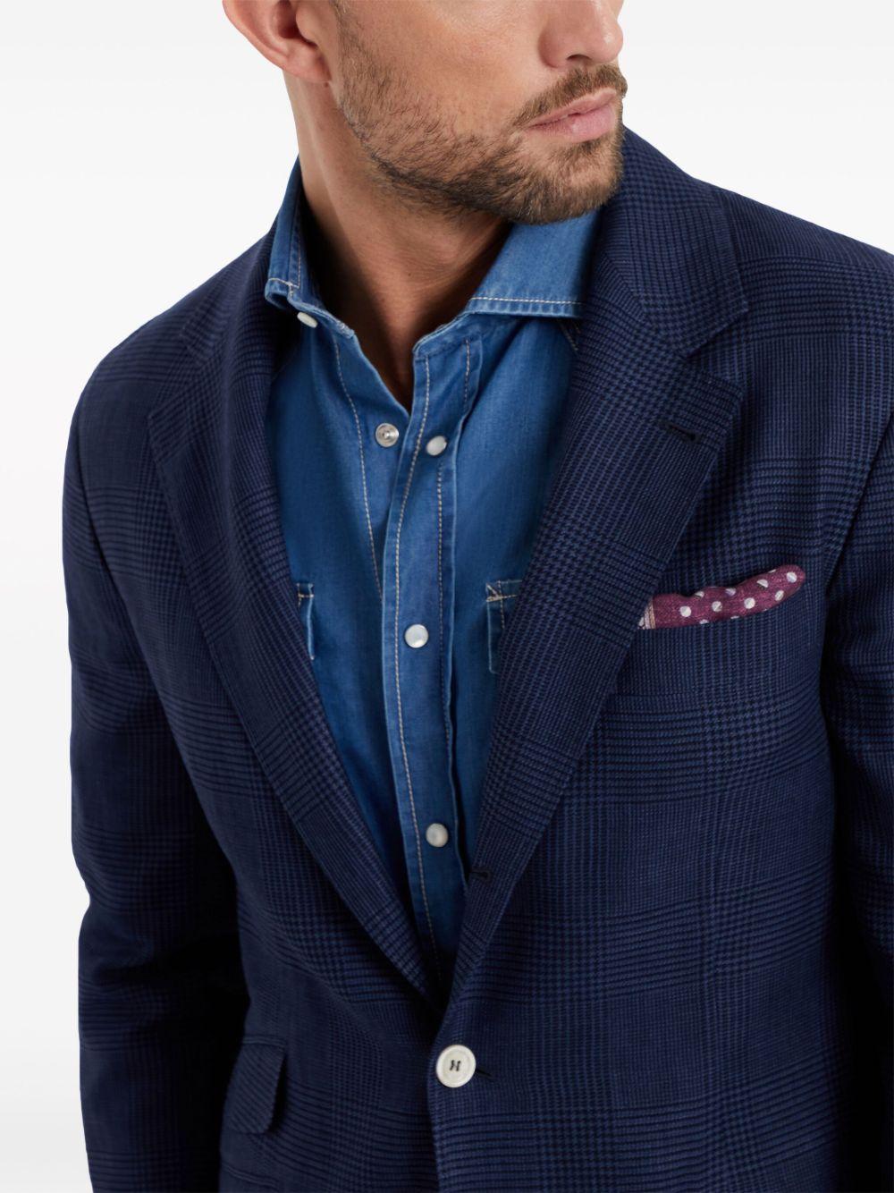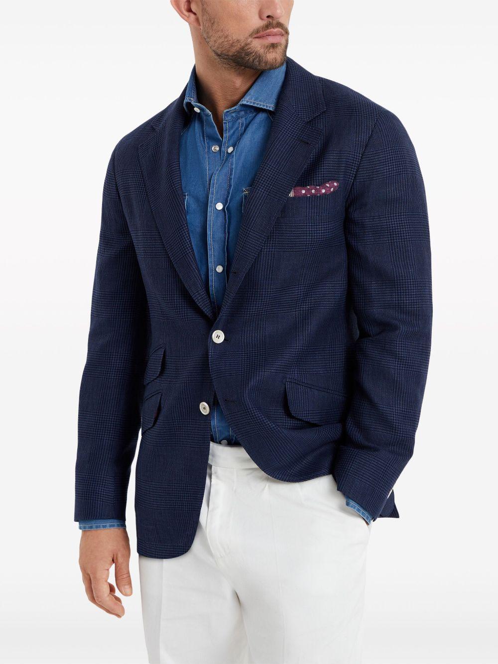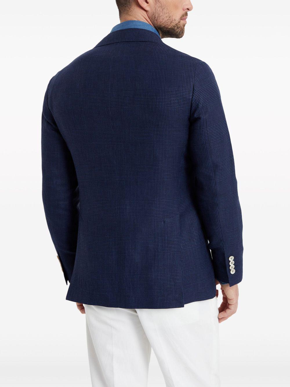 Brunello Cucinelli single-breasted linen blazer | Blue | navy blue | linen-wool blend | houndstooth pattern | notched lapels | shoulder pads | long sleeves | front button fastening | chest welt pocket | side flap pockets | straight hem | Wool/Linen/Flax/Silk/Ramie | Blazers | Jackets | Clothing | Men