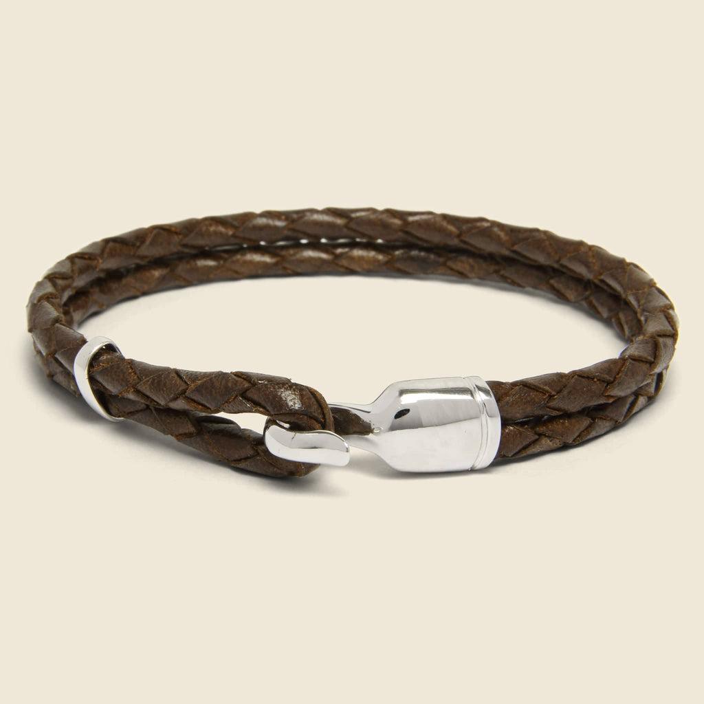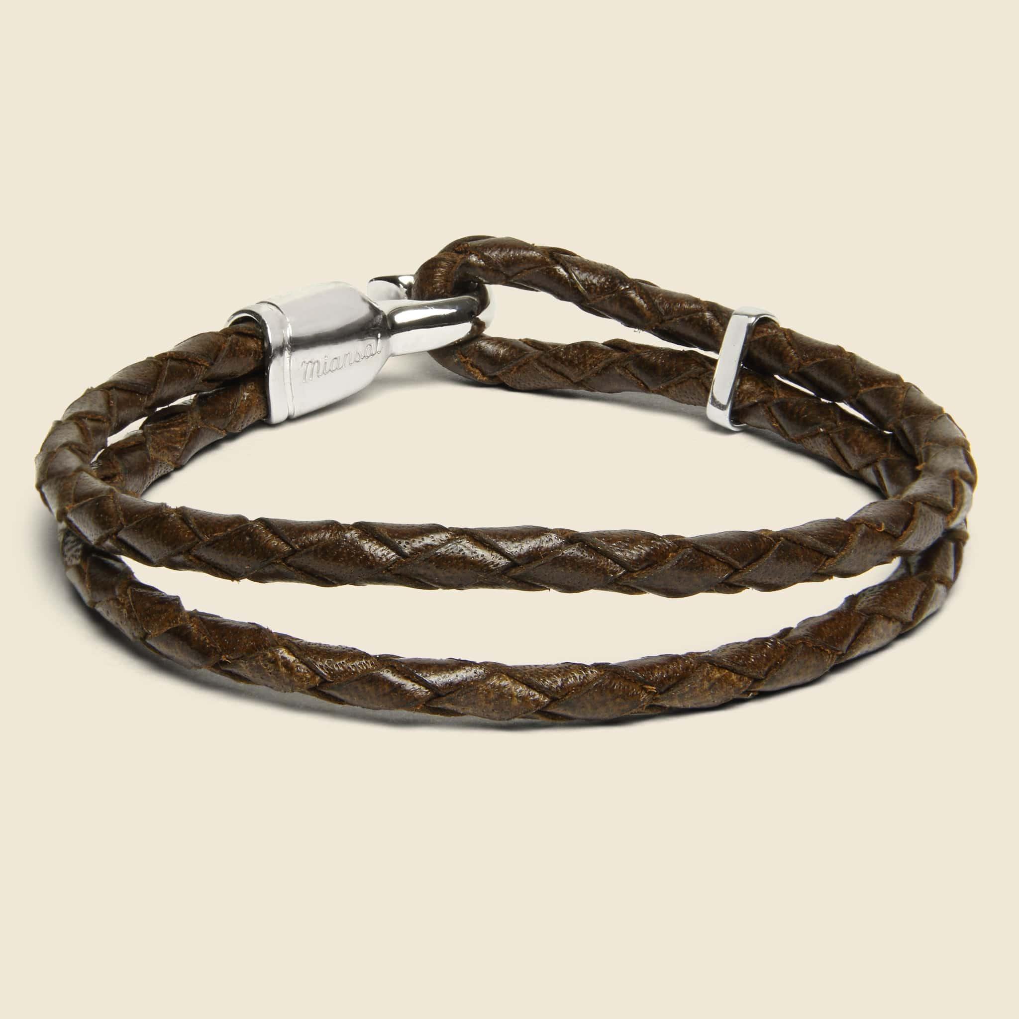 The Single Trice Bracelet from Miansai is woven with genuine Italian leather featuring a sterling silver hook closure and small sliver accent. Handmade in the US. Handwoven Italian Leather Small silver hook closure and silver detailing on the band Two leather straps Made in USA Dimensions: Full Length: 6.75" | Width: .25"
