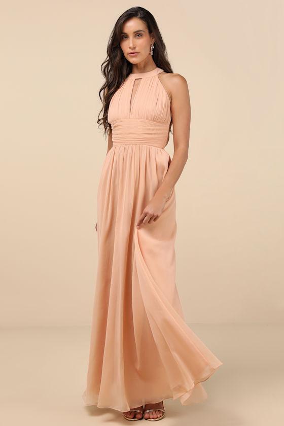 Made for the maid of honor (or just a really stylish guest), this airy chiffon gown will make sure that you stand out amongst the crowd. The pleated bodice features a modified tying halter neckline, a flirty front cutout, and a tasteful open back, all atop a flowy, A-line skirt with a sweeping maxi hem. Hidden back zipper/clasp.