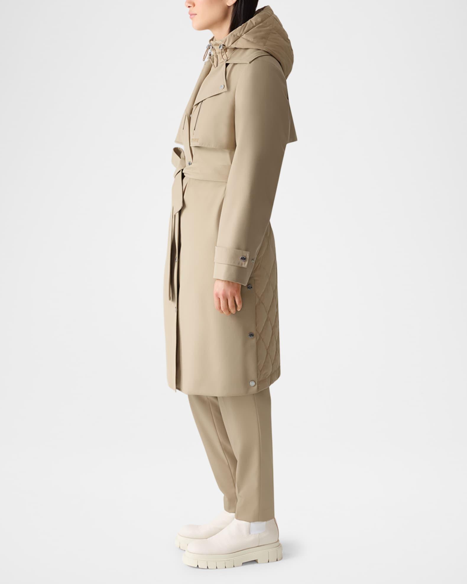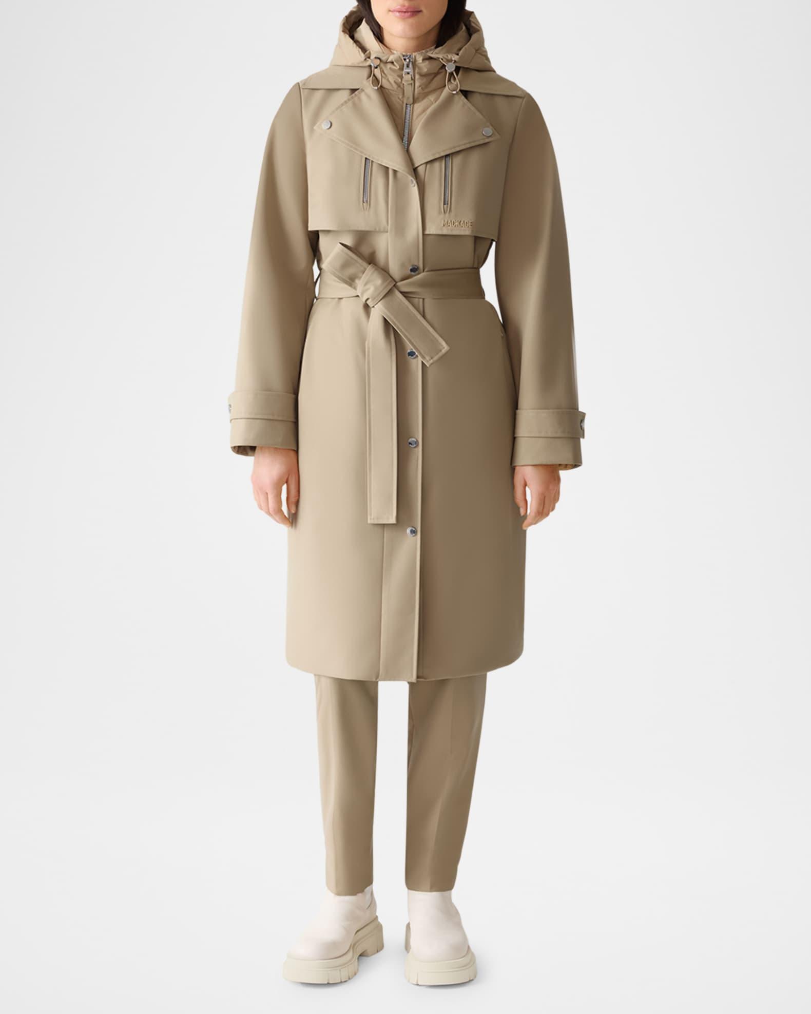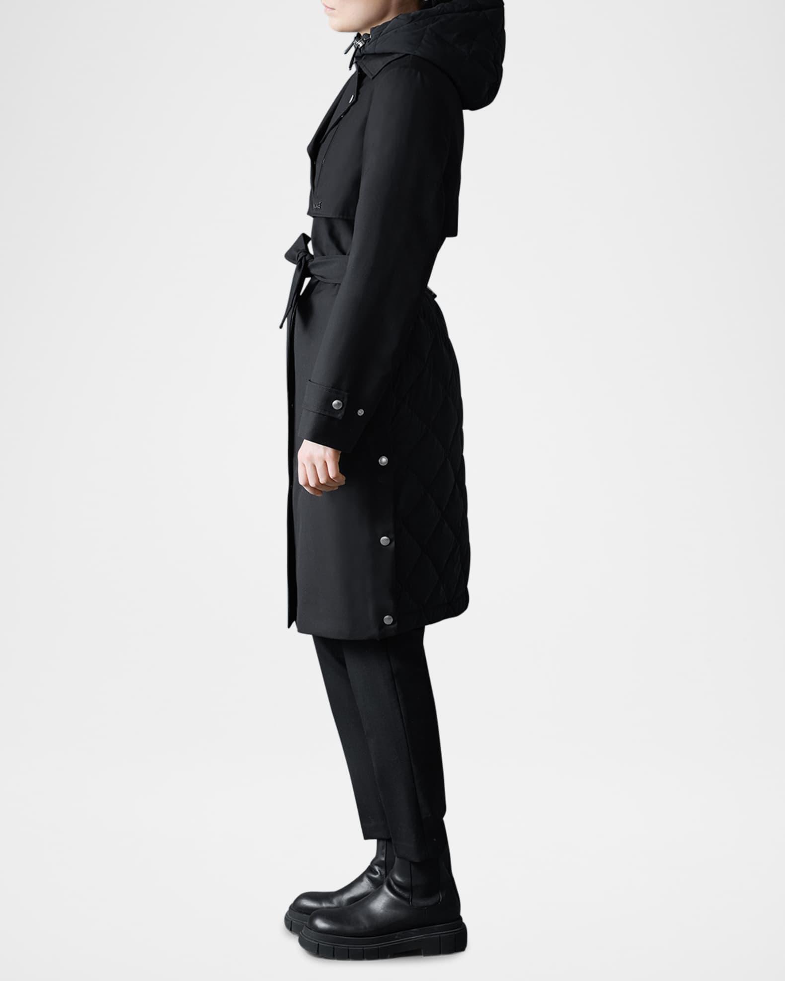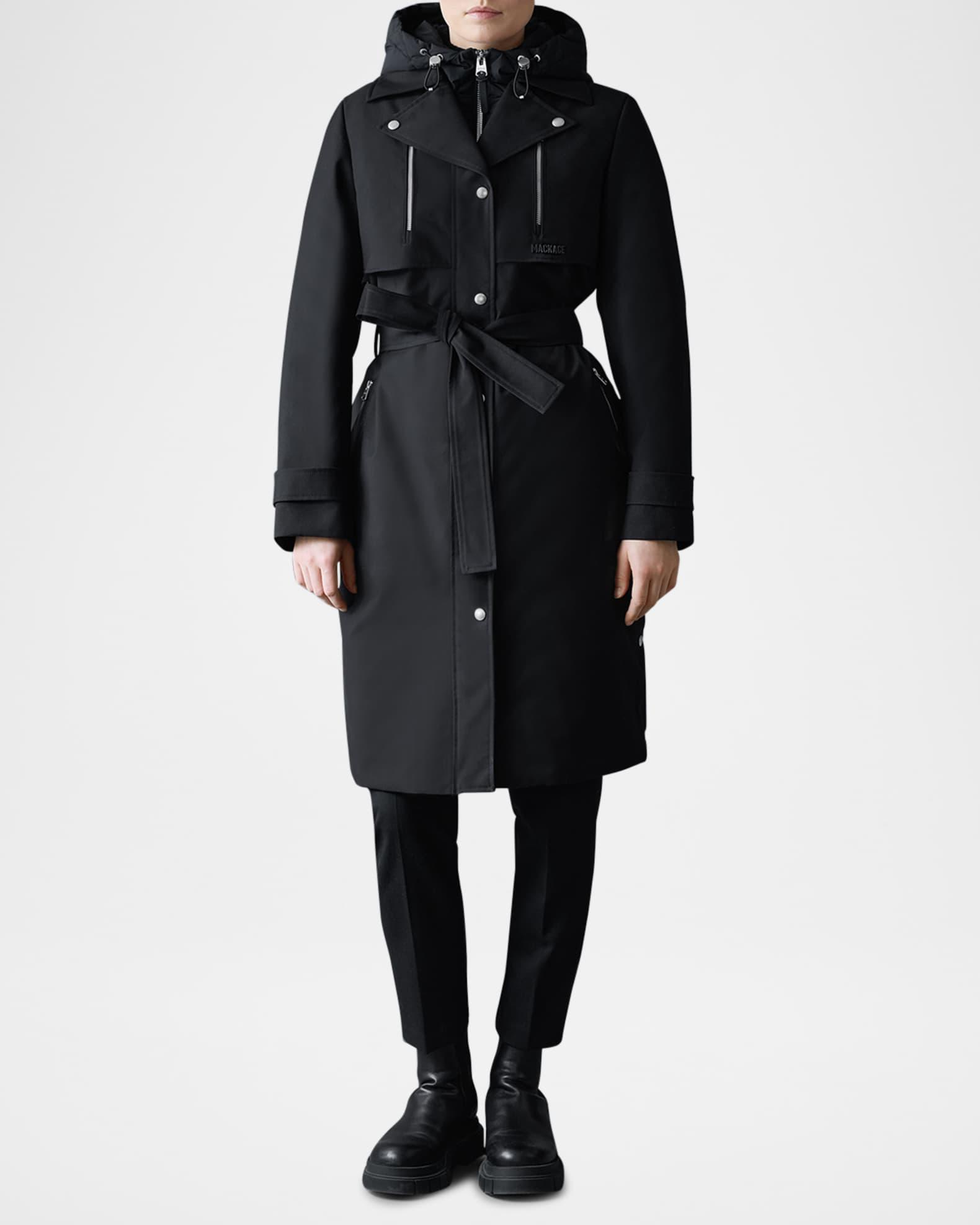 The "Siobhan" trench coat by Mackage is designed with function in mind and is water-repellent and windproof. Finished with technical details, Siobhan is the perfect elevated trench coat for year-round wear. Includes removable down-filled bib for added warmth Adjustable drawcord hood with storm visor Notch lapels; zip chest pockets with silicone branding Long sleeves with adjustable cuffs Adjustable self-tie belt Side zip pockets Classic fit Side vents with snap closure for added movement Zip-front with snap-over placket Polyester Fill: Down/feather Lining: Nylon/recycled nylon Dry clean Imported