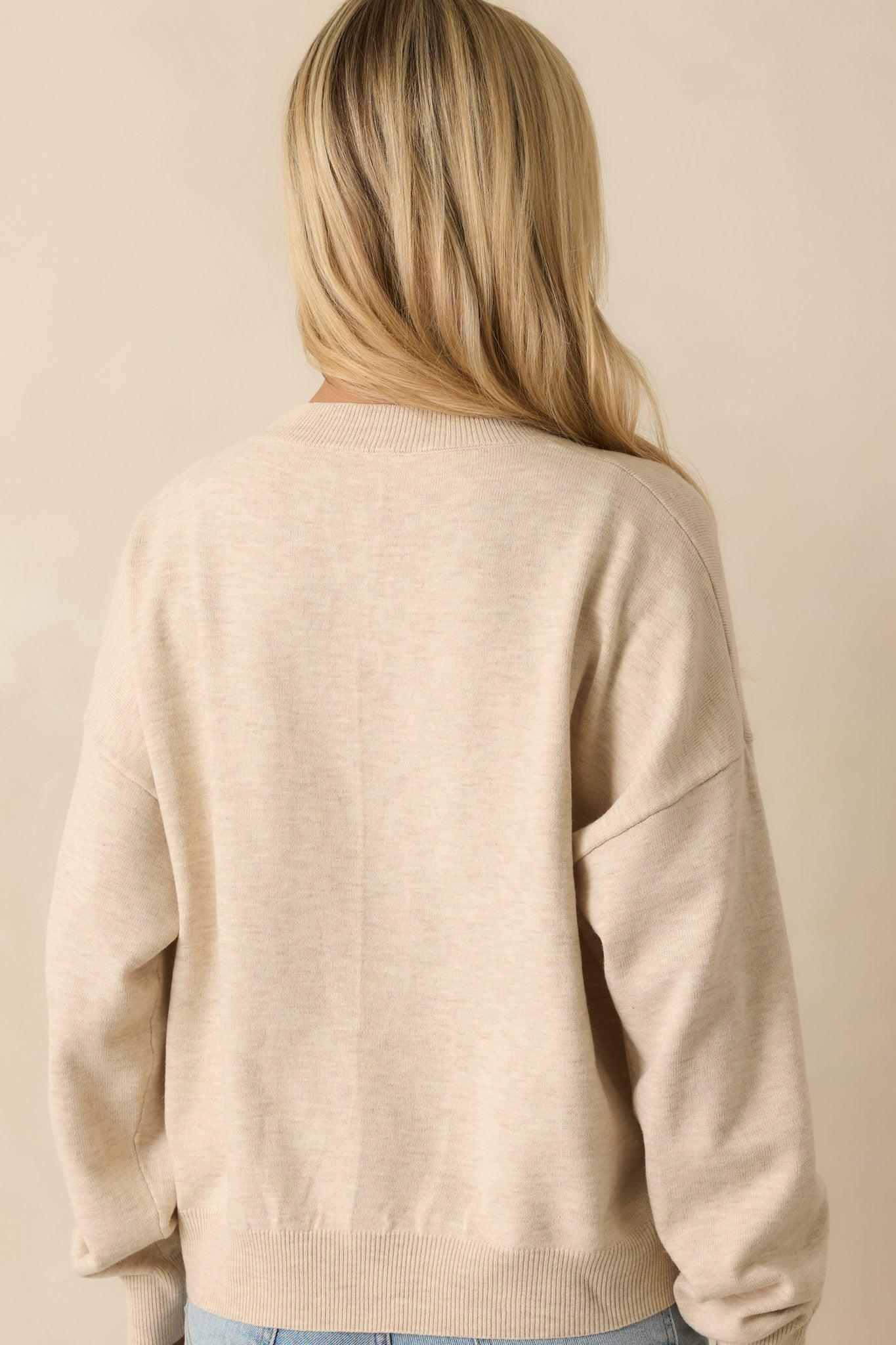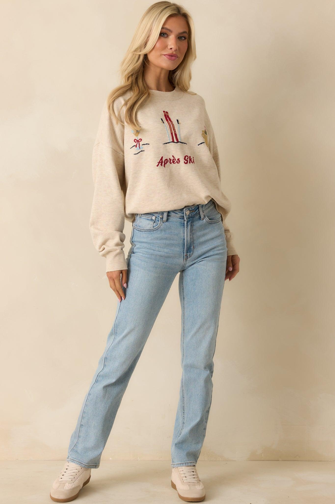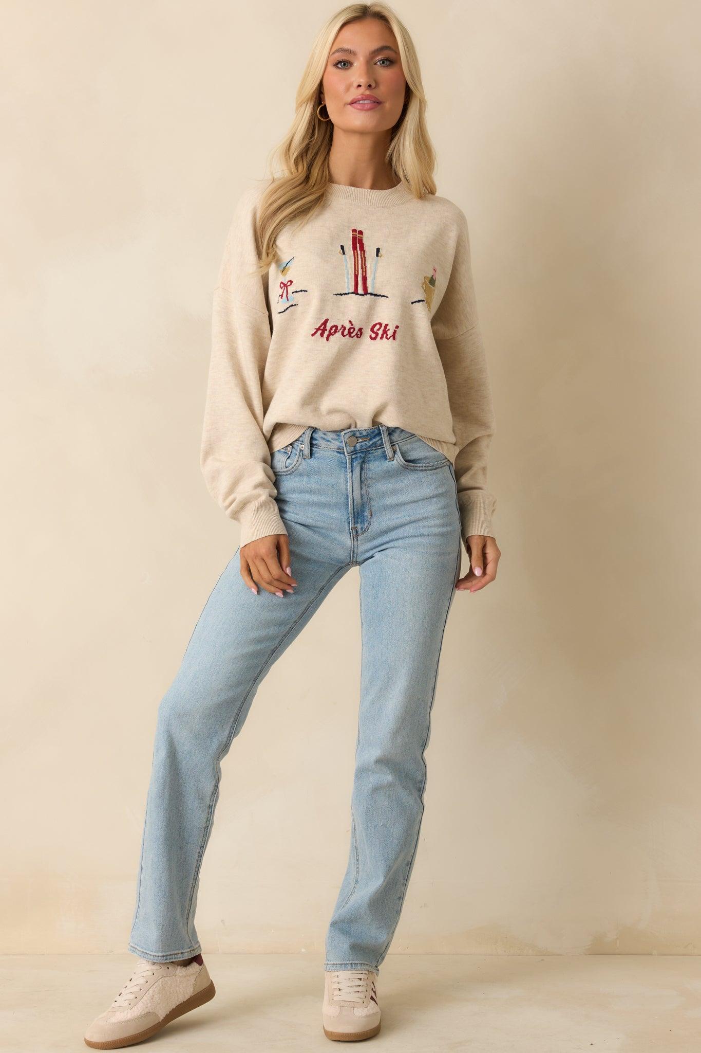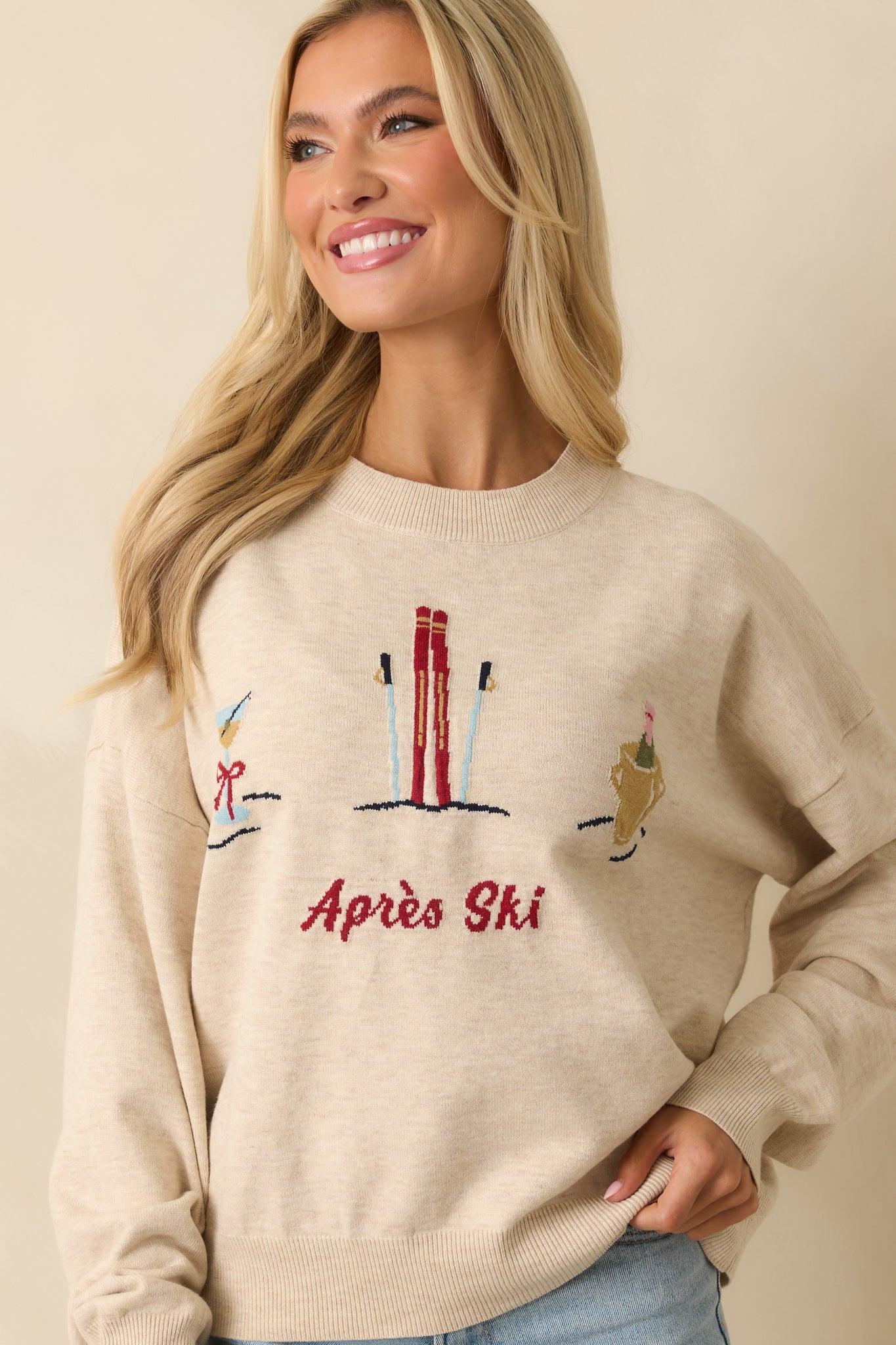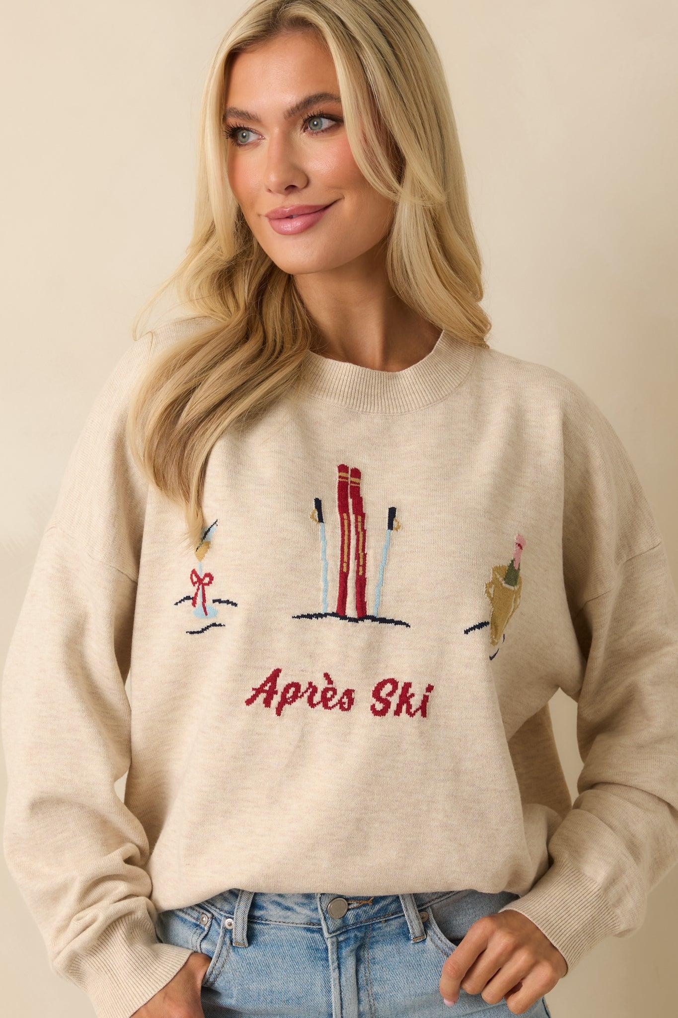 You came, you conquered the mountain — now it’s time for the fun part. The Sips After Slopes Heathered Oatmeal Après Ski Crewneck Sweater brings that laid-back après ski energy with playful embroidered skis and cocktails that say cheers to every downhill victory. Soft, relaxed, and made for cozy fireside hangs, it’s the perfect excuse to head straight from the lift to the lodge. This heathered oatmeal crewneck sweater features a soft knit fabric with a relaxed silhouette, long sleeves, and ribbed trim at the neckline, cuffs, and hem. Front includes embroidered ski and cocktail motifs with “Après Ski” script. 50% Rayon, 28% Nylon, & 22% Polyester Unlined Hand Wash Cold Manufactured in China Designed in The USA Model is 5'6" and Wearing a Size Small, Clipped, Model is a True X-Small