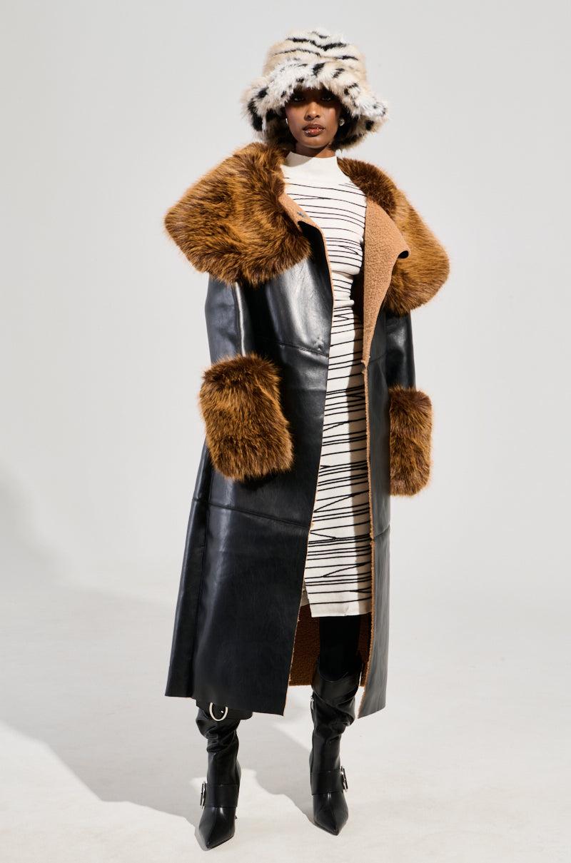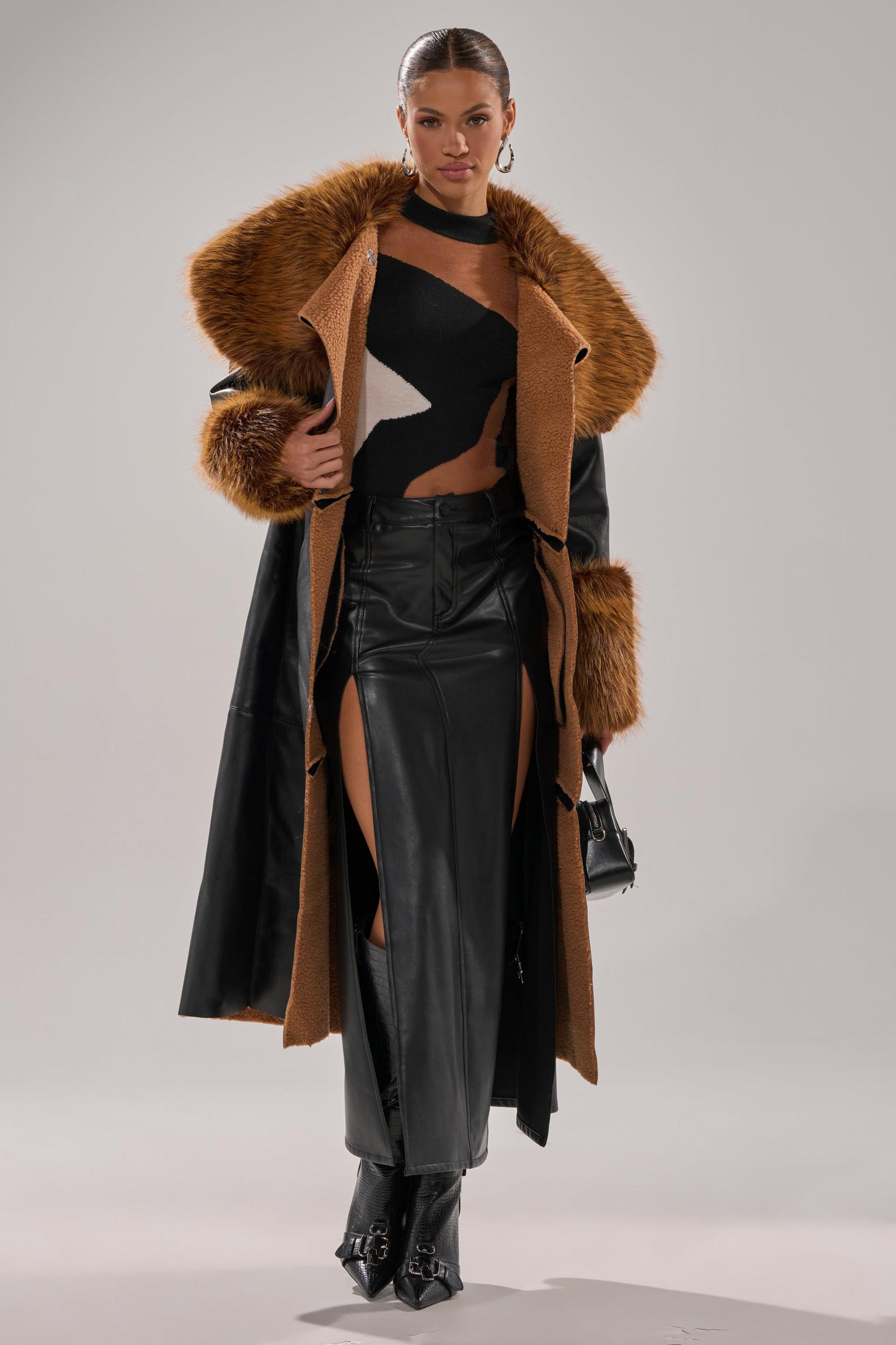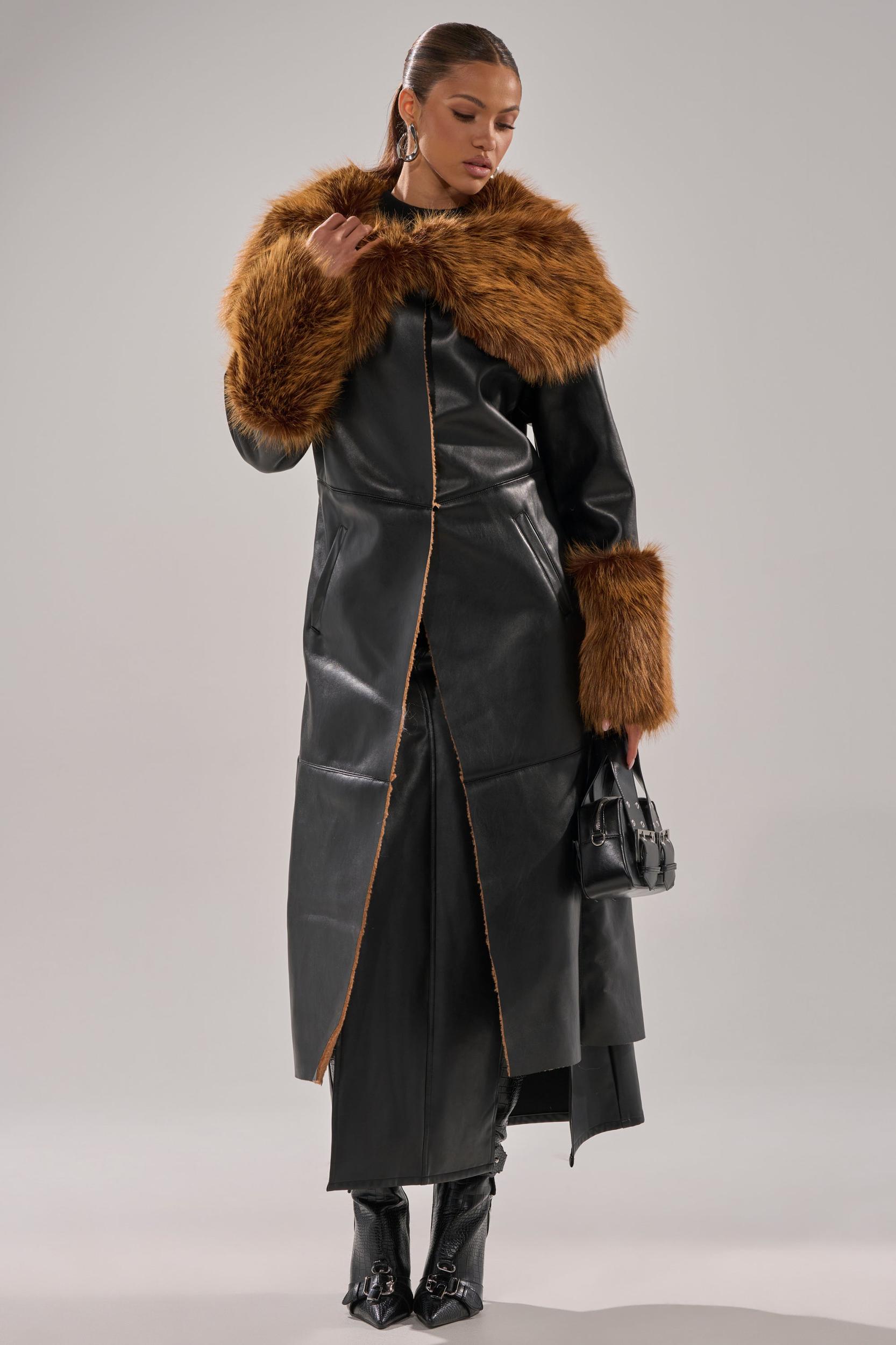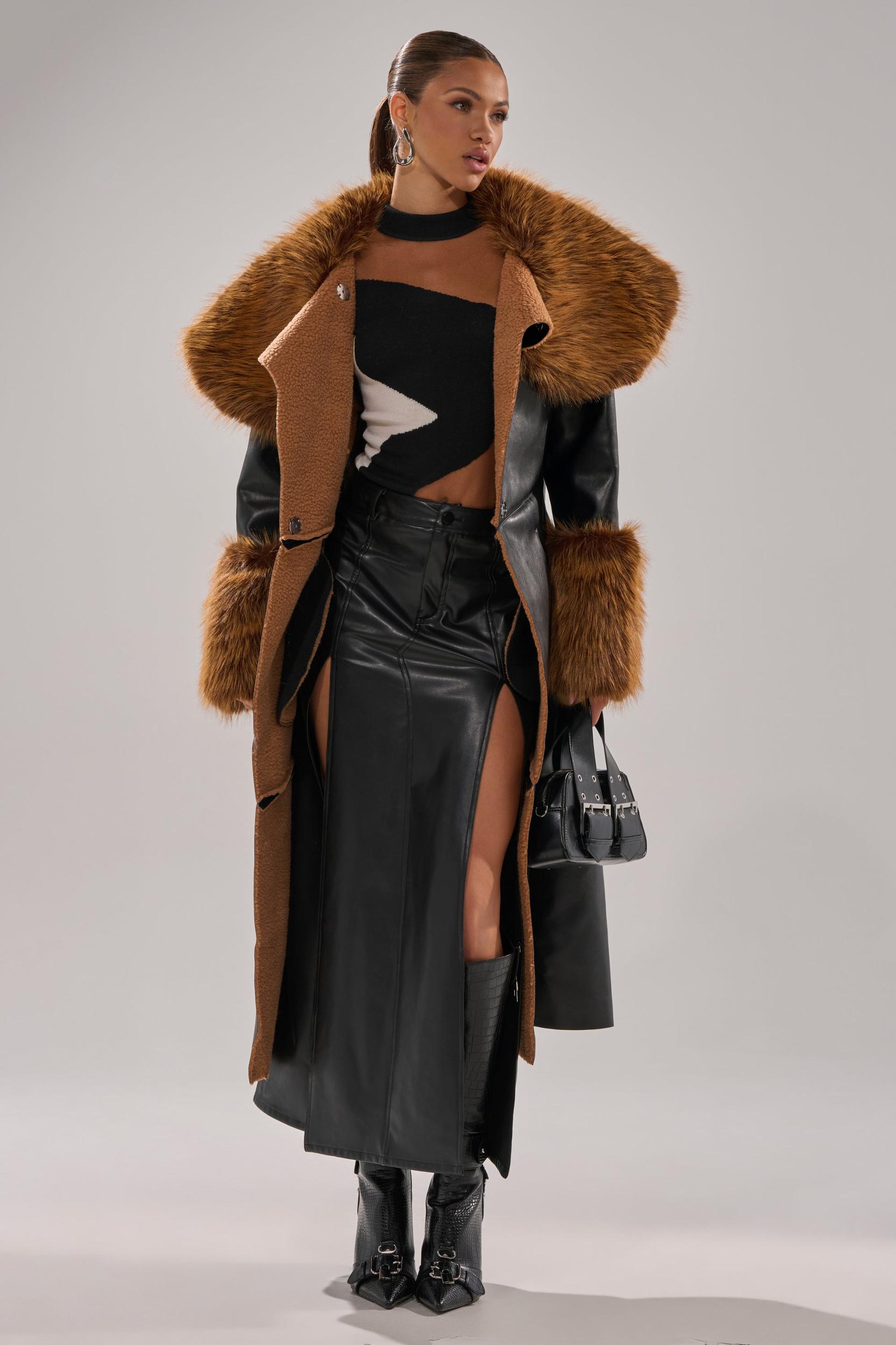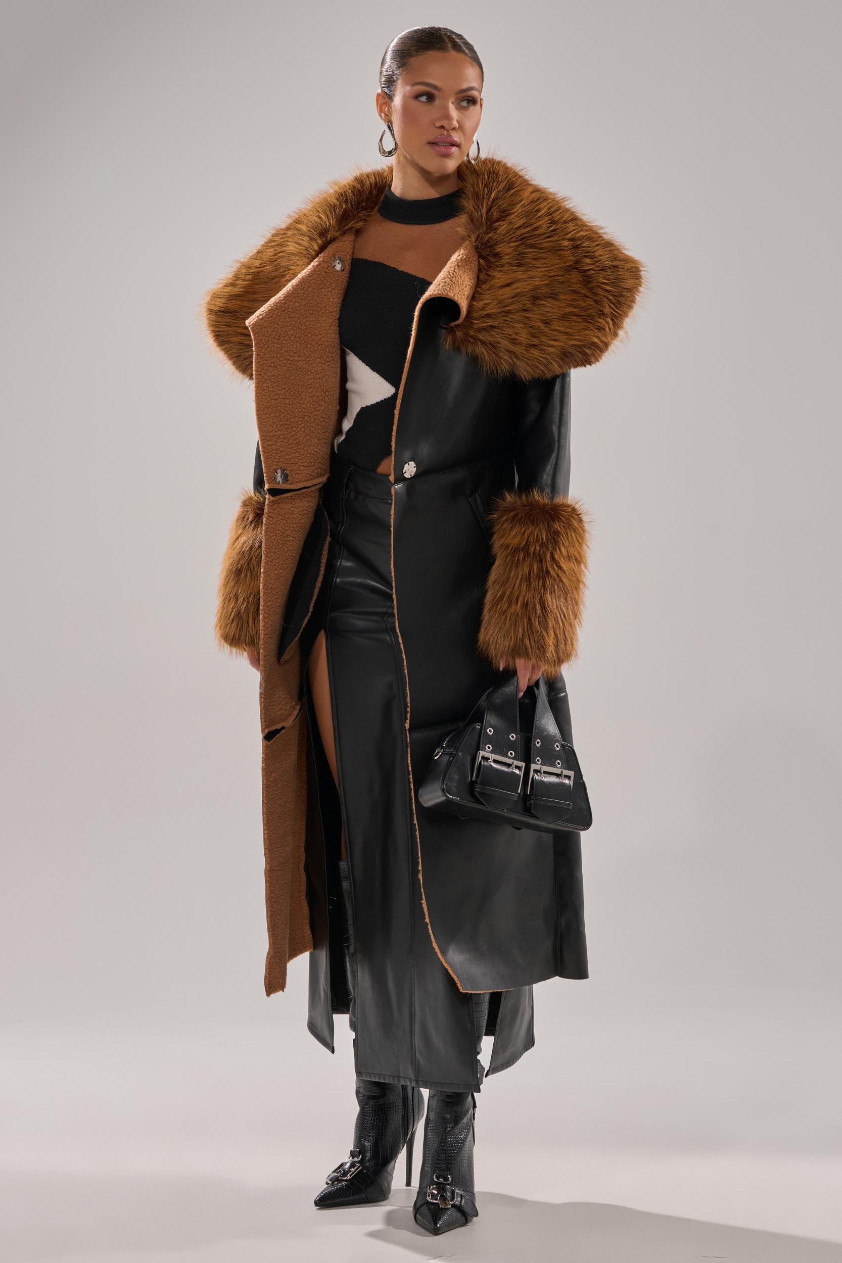 No one will be able to resist your call in The AKIRA Label Siren Fur Trim Trench Coat. This sumptuous stunner is crafted from sleek, subtly pebbled faux leather and boasts a maxi-length silhouette, an ultra-wide, shawl-like collar crafted from impossibly plush, hyperrealistic faux fur, and long sleeves with coordinating, oversized faux fur cuffs. It also features spacious side slant pockets, a super soft, sherpa-lined interior, and discreet snap-button front fastenings. - Shell 1: 100% Polyester with PU Coating, Shell 2: 100% Polyester- Dry Clean Only- No Stretch- Imported (all measurements approximate from size small)- 49” Shoulder to Hem- 19” Shoulder to Shoulder- 25” Sleeves- Model is 5’8” and wearing a size small Product ID: 439142
