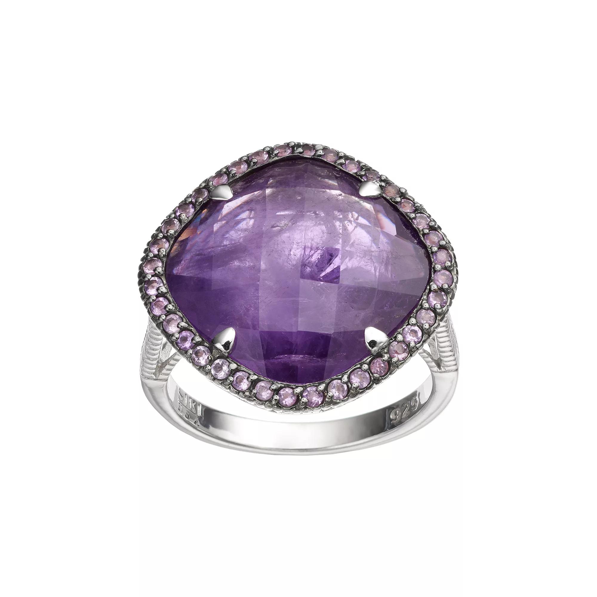 Accentuated with genuine amethyst stones situated in a halo motif, this sterling silver ring offers vibrant beauty.RING DETAILS Width: .89 in. Metal: sterling silver, black rhodium-plated sterling silver Additional details: milgrain and filigree details STONE DETAILS Stone type: genuine amethyst Total weight: 8 3/4 ct. Center stone size: 15 mm x 15 mm Shape: checkerboard cut, round Setting: prong, bezel Size: 6. Color: Purple. Gender: female. Age Group: adult.