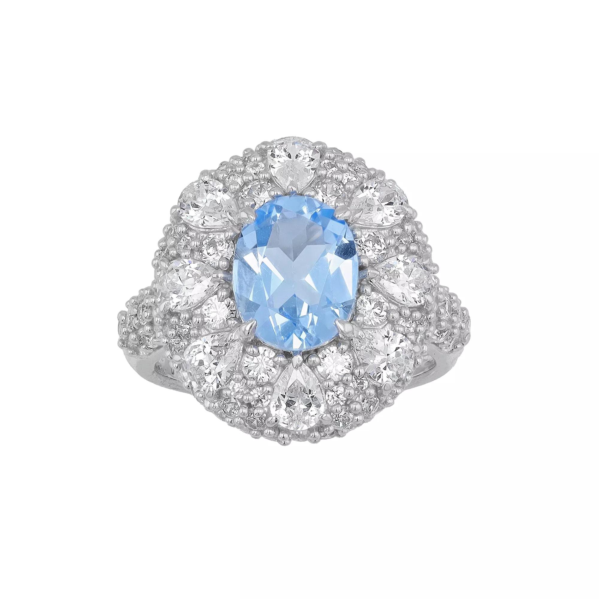 Add a vintage-inspired touch of elegance to your jewelry box with this sterling silver SIRI USA by TJM cubic zirconia and lab-grown blue quartz halo ring. Add a vintage-inspired touch of elegance to your jewelry box with this sterling silver SIRI USA by TJM cubic zirconia and lab-grown blue quartz halo ring. FEATURES Band width: 0.85 in. Shank style: halo Band fit: comfort fit Nickel free Metal: sterling silver Plating: rhodium Finish: polished Packaging: boxedSTONE DETAILS Stone type: lab-grown blue quartz, cubic zirconia Total weight: 4 1/2 ct. Center stone weight: 1 5/8 ct. Center stone size: 9 mm x 7 mm Shape: oval Setting: prong Gemstones may have been treated to enhance their appearance. Special care may be required. Please visit our Gemstone Treatment & Special Care Guide for more information. Size: 6. Gender: female. Age Group: adult.