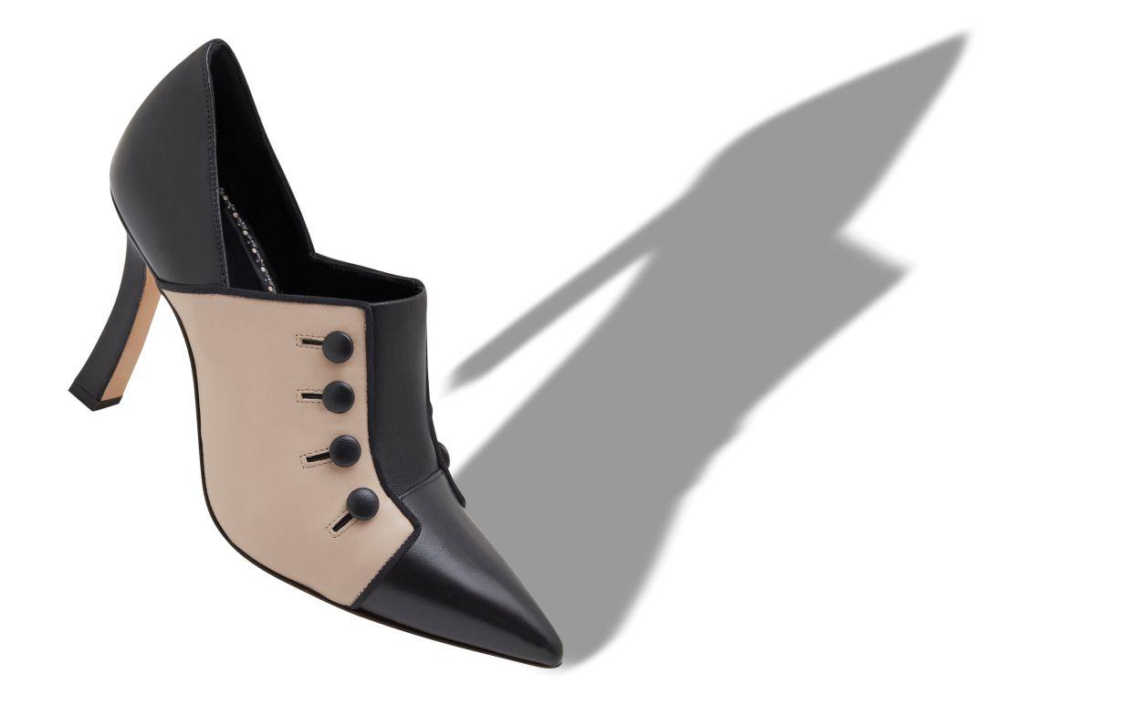 Beige nappa leather pointed toe shoe booties featuring black toe cap, counter and edging. Finished with decorative buttonhole design with buttons and flared block high heel.