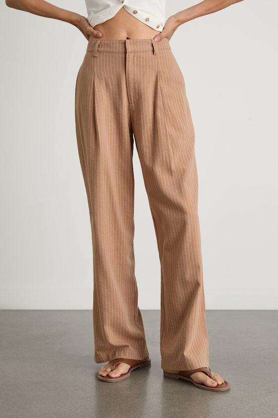 Designed for the coolest girls in the office and on the streets, these pinstriped trousers feature a cotton-linen blend composition that's lightweight and perfect for warmer months. Belt loops, a top clasp closure, and a hidden zip fly secure the mid-rise fit, while pleated detailing and diagonal front pockets complete the relaxed, straight-leg silhouette.