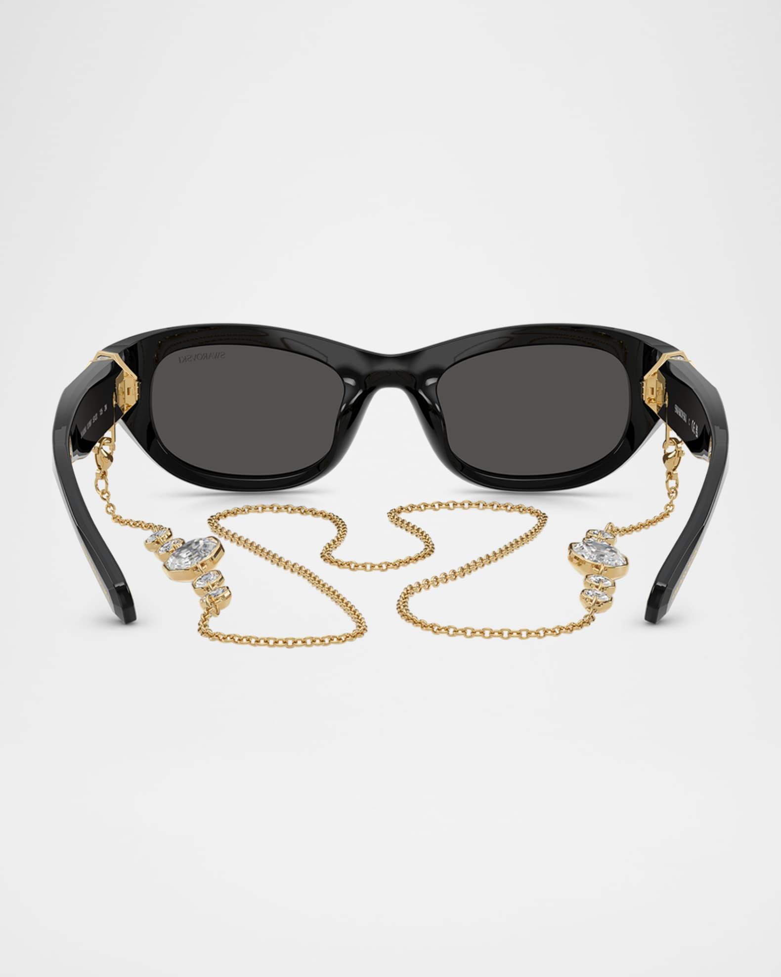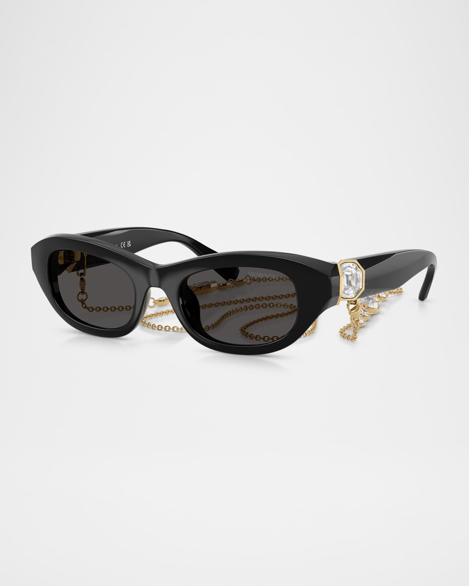 Swarovski "SK6036U" rectangle sunglasses in plastic Eye/bridge/temple (in mm): 50-20-135 Solid lenses Saddle nose bridge Wide, tapered arms Signature embellished temples Removable chain Comes with a cleaning cloth and case Plastic Spot clean 100% UVA/UVB protection Made in Italy Proposition 65 warning for California residents