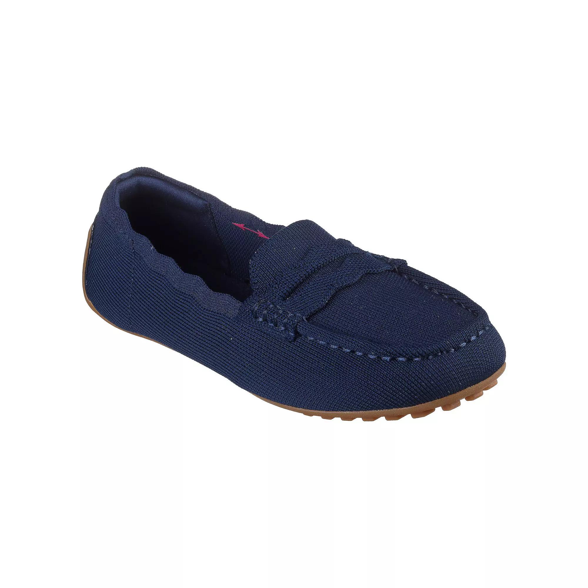 Step into effortless style and all-day comfort with these slip-ons that blend a classic penny loafer design with modern flair. The stretch fit and cushioned insole make them feel like a dream, while the thoughtful eco-friendly materials mean you can strut with a clear conscience. Click this FOOTWEAR GUIDE to find the perfect fit and more! - https://www.kohls.com/feature/shoesizeguide.jsp. FEATURES: Scallop-trimmed knit upper in a penny loafer silhouette, Flexible drivers'-style outsole with back heel and sole nubs, Made with at least 20% recycled content by weight, Skechers Air-Cooled Memory Foam cushioned comfort insole, Stretch Fit design for sock-like comfort, Crafted with 100% vegan materials, Water-Resistant. DETAILS: Slip-on closure, Treaded outsole, Moc toe, 0.25" heel height, Imported. MATERIAL & CARE: 66%Recycled post-consumer polyester (RM0189) + 24%Polyamide (nylon) (RM018), Recycled post-consumer polyester, polyamide, elastane, Rubber outsole, Polyester lining, Foam footbed, Machine washable. RESPONSIBLE Contains recycled materials. Size: 5.5. Color: Navy. Gender: female. Age Group: adult. Material: OTHER MATERIAL.