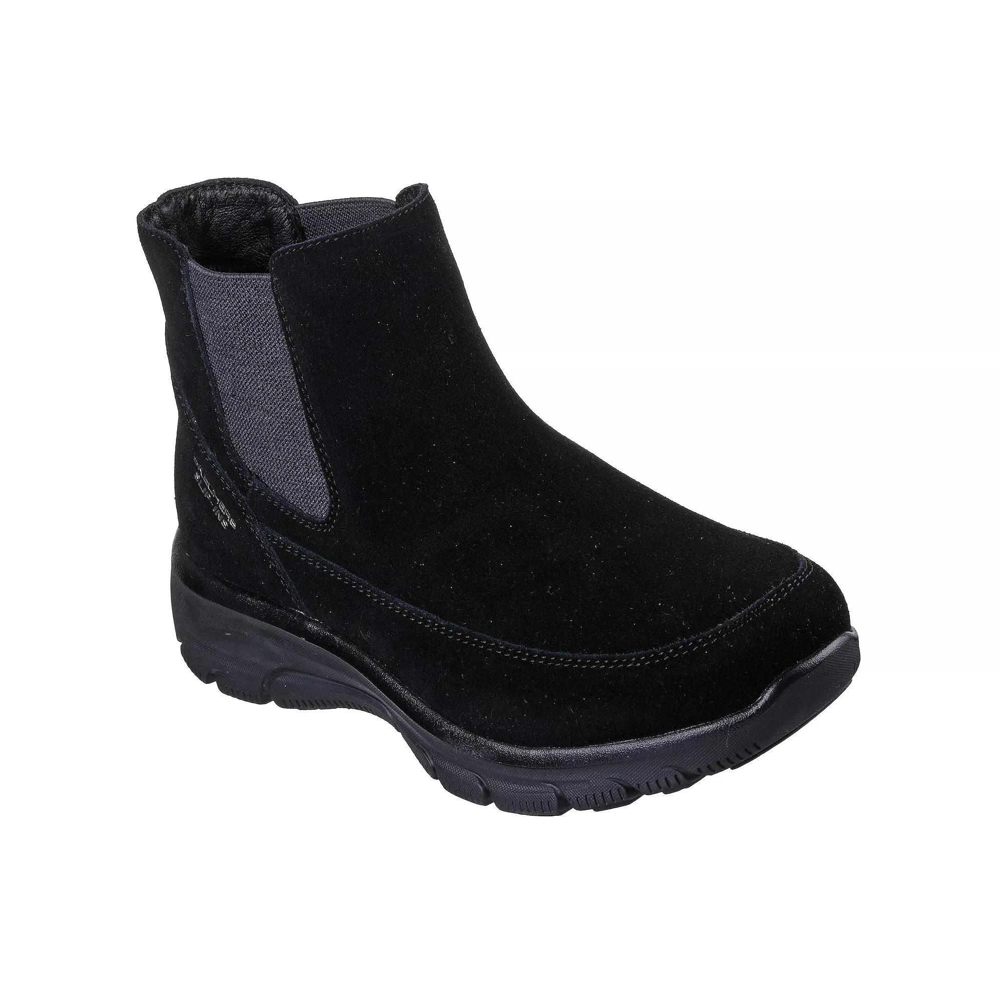 Discover effortless style and unmatched comfort with Skechers. Designed for a relaxed fit, these slip-in boots feature a secure heel pillow and plush air-cooled memory foam insole, making them perfect for all-day wear while resisting water and stains for a worry-free experience. Click this FOOTWEAR GUIDE to find the perfect fit and more! - https://www.kohls.com/feature/shoesizeguide.jsp. FEATURES: Hands Free Slip-ins for an easy fit, Exclusive Heel Pillow for secure foot placement, Air-Cooled Memory Foam cushioned comfort insole, Relaxed Fit for roomy comfort at toe and forefoot, Water-repellent treatment with 3M Scotchgard, Crafted with 100% vegan materials, Chelsea Suede upper with Fuller Chenille Lining, Flexible traction outsole. DETAILS: Round toe, Slip-on, 1.25 inch heel height, Slip-resistant outsole, 0.25 inch platform height, Imported. FIT & SIZE: Ankle boot shaft detail, 9-inch boot shaft circumference, 4-inch boot shaft height. MATERIAL & CARE: Suede upper, Foam footbed, Fuller Chenille lining, Rubber outsole, Spot clean. Size: 5.5. Color: Black. Gender: female. Age Group: adult.