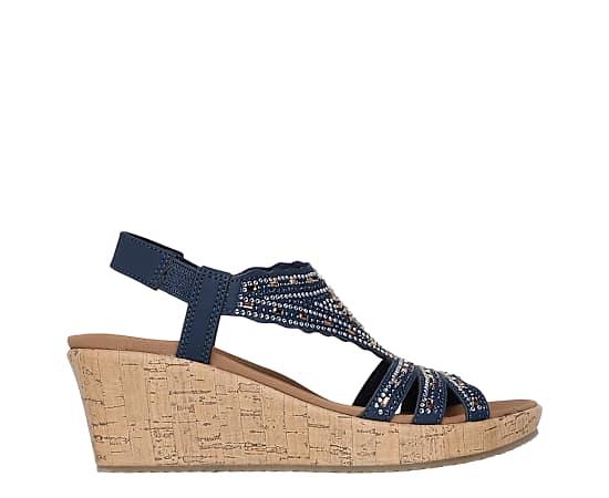 Skechers Cali Beverlee Dazzling Charm Women's Wedge Sandal - NavyMove into the room, smoothly, in the Skechers Cali Beverlee - Dazzling Charm women's wedge Sandal. With a rhinestone embellished upper featuring a strappy design for extra flair, this pull-on Sandal lets you shine in comfort. Luxe Foam and a natural cork veneer midsole cushion on that perfect height wedge heel. Synthetic upper Pull-onRhinestone accentsLuxe Foam footbed platform; 2 wedge heel