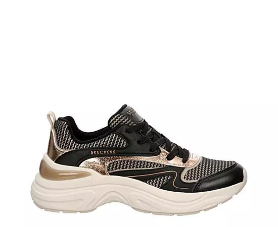 Skechers Street: Hazel Women's Sneaker - Black Bring the party with you in the Skechers Street: Hazel - Metallic Soiree Sneaker. Featuring a two-tone mesh & synthetic upper with a metallic trim for extra style, this lace-up Sneaker is made to dazzle. The Skechers Air-Cooled Memory Foam insole cushions every step, while the outsole provides flexible traction on any surface. Mesh/synthetic upper Lace-up closure Metallic trim Air-Cooled Memory Foam insole Traction outsole
