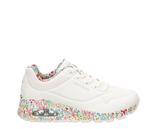 Skechers Street Uno Women's Sneaker - White/FloralEnhance your style with nature in the Skechers Street Uno - Majestic Garden Sneaker. With a durabuck upper featuring floral print trim, this lace-up Sneaker blends fashion with art. The Skechers Air-Cooled Memory Foam insole and Skech-Air visible air- Cushioned midsole comfort your foot, while the outsole provides flexible traction. Synthetic upper Lace-up closure Air-Cooled Memory Foam insoleSkech-Air midsoleTraction outsole