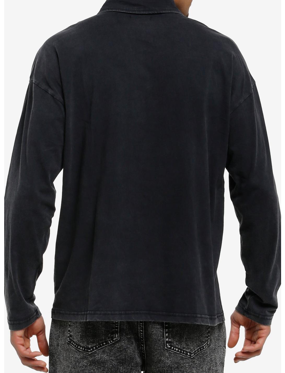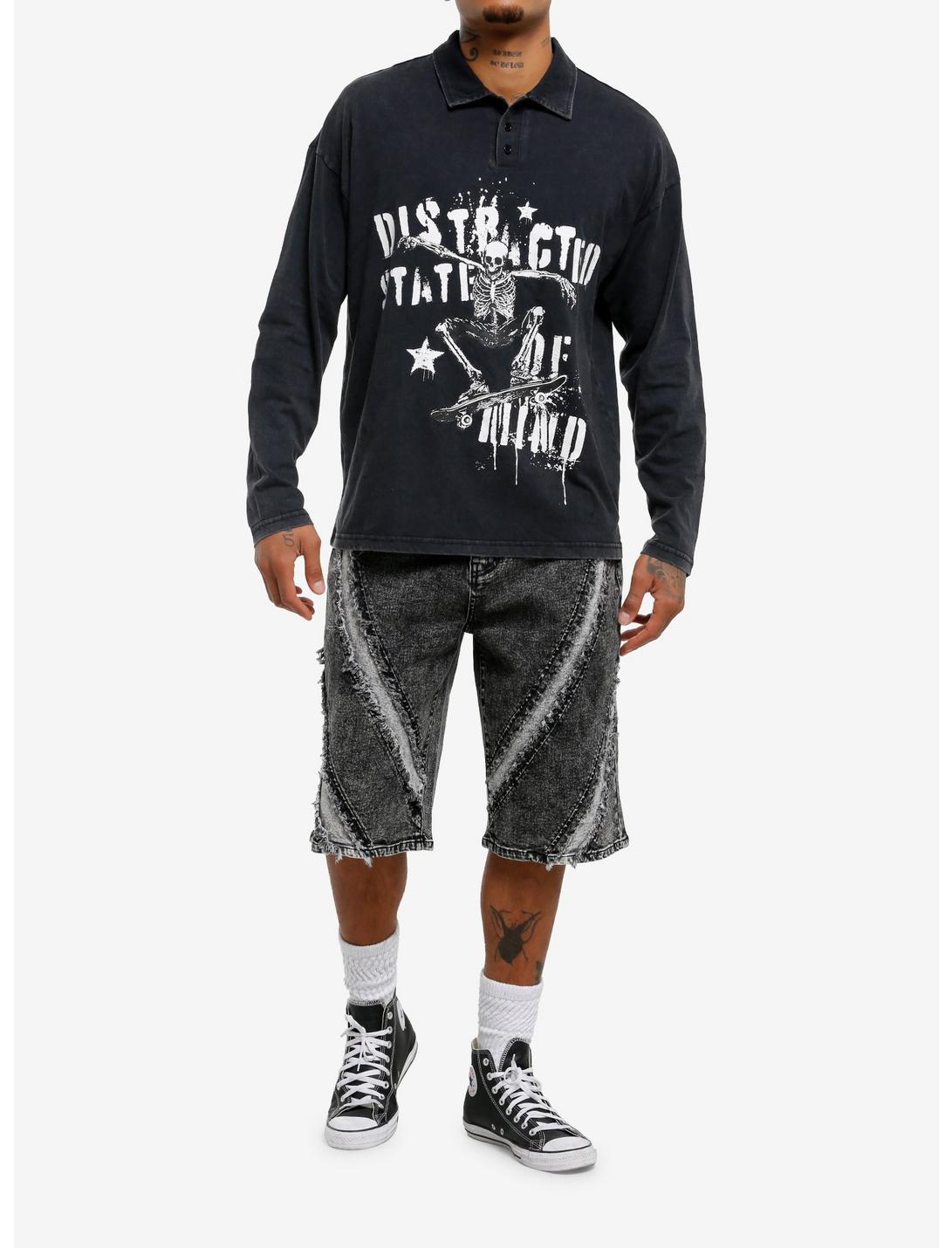 In a distracted state of mind? This washed black long-sleeve polo tee is printed on the front with a skating skeleton, and stencil graffiti-style text reading, "Distracted State of Mind" and a star.100% cotton jerseyWash cold; dry lowImportedListed in men's/unisex sizesModel is 6'1"Model wears size Medium