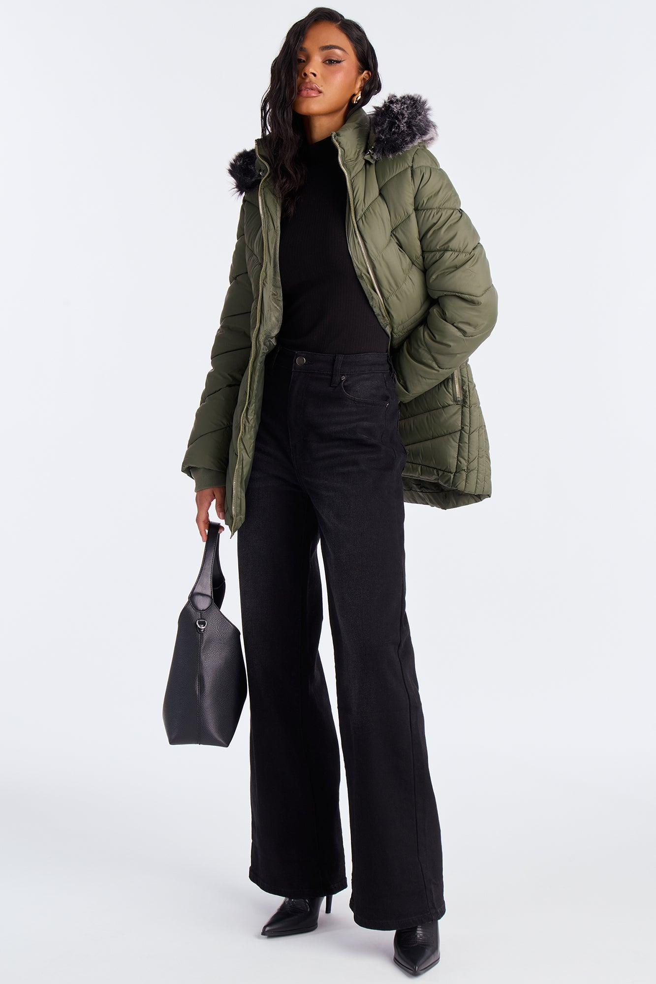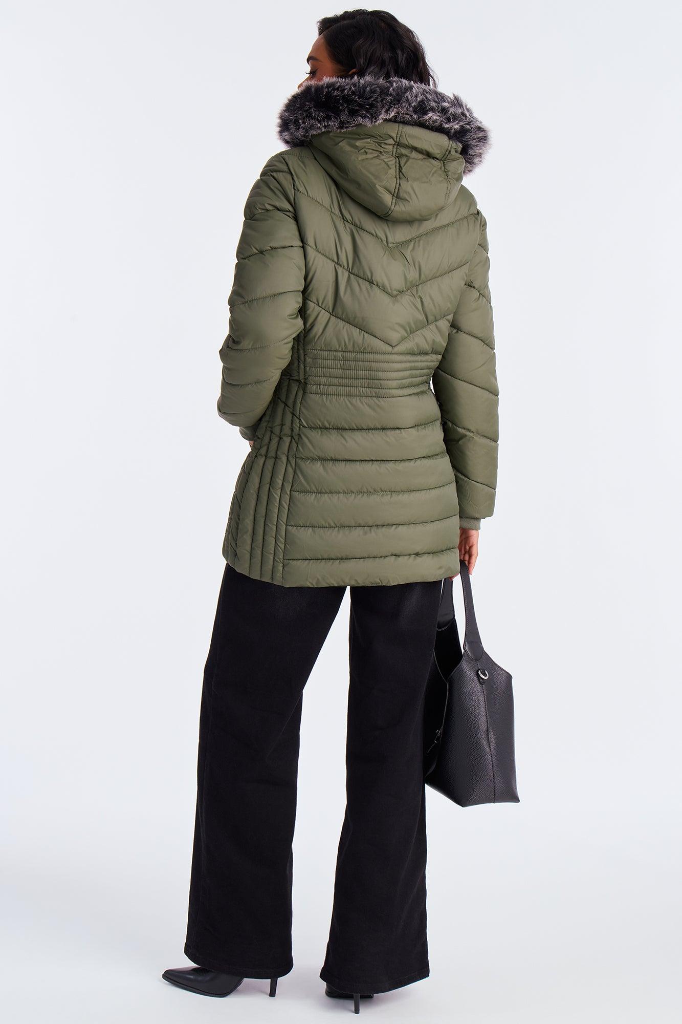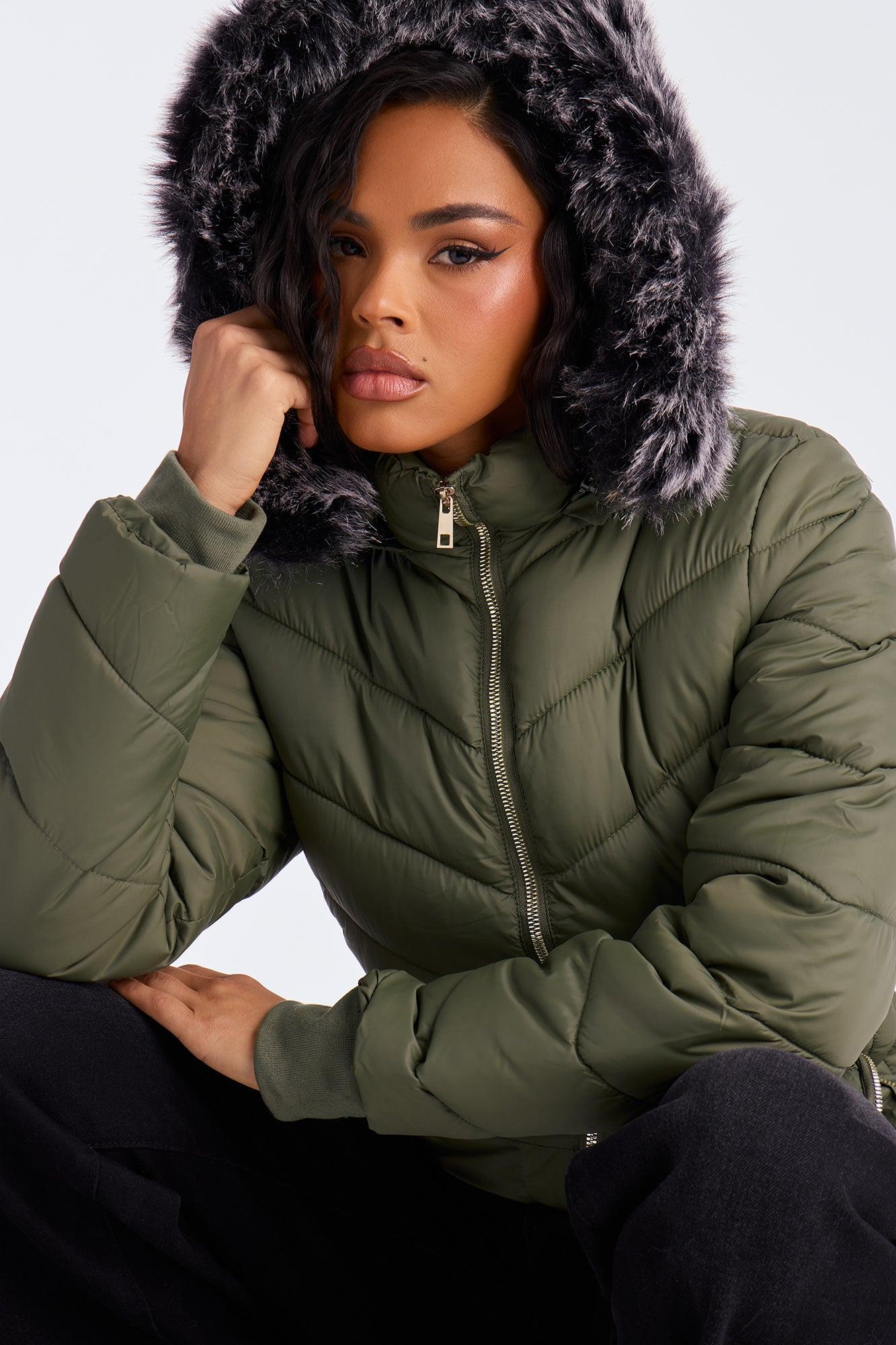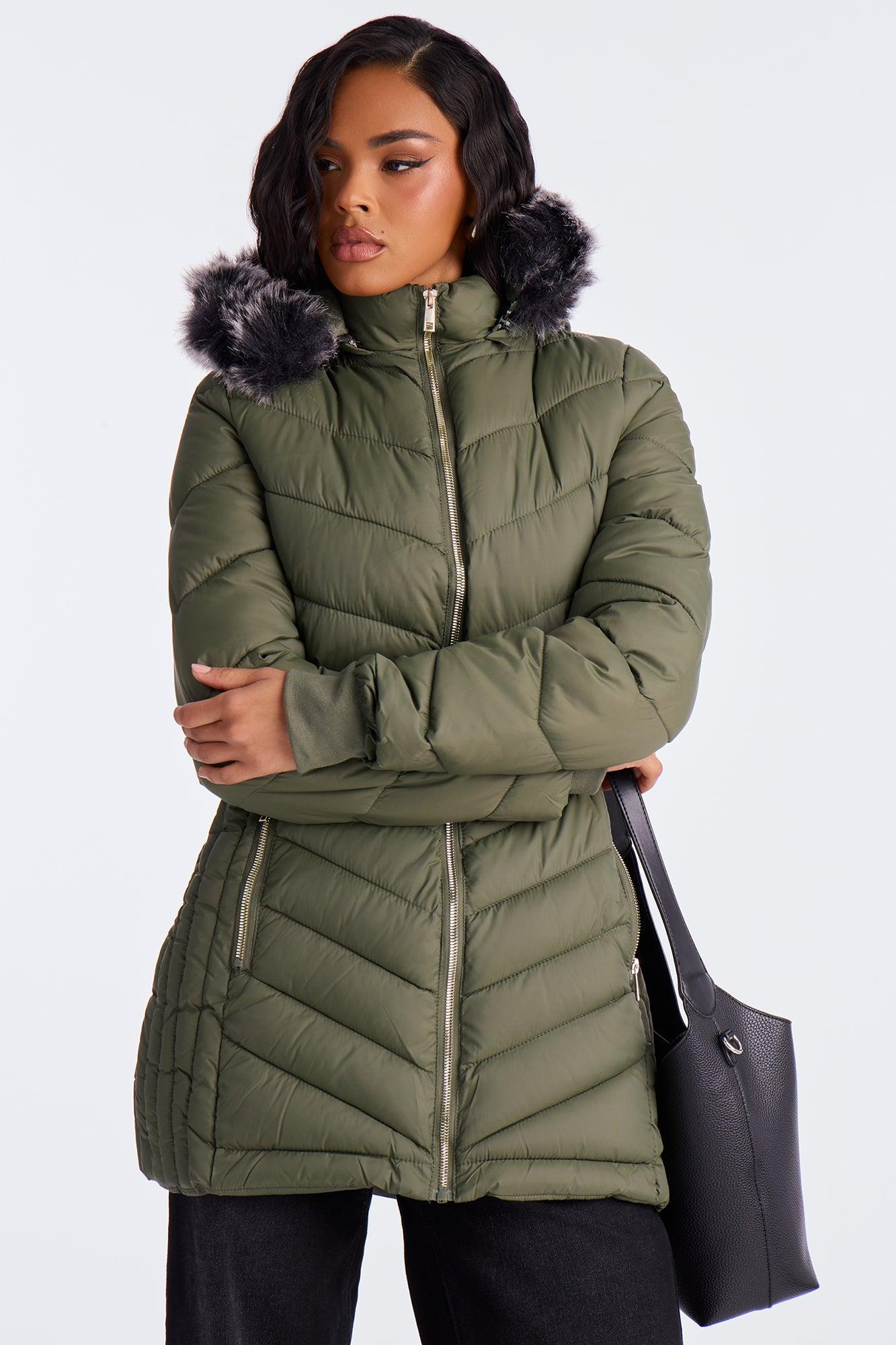 Available In Black, Chocolate, Olive And Pearl. Puffer Jacket Hooded Long Sleeve Nylon Full Zip Fully Lined Disclaimer: Faux Fur Fall Out May Happen. Self: 100% Polyester Upper Body and Hood Lining: 100% Polyester Lower Body and Sleeve Lining: 100% Polyester Filling: 100% Polyester Faux Fur Trim: 75% Acrylic 25% Polyester Imported