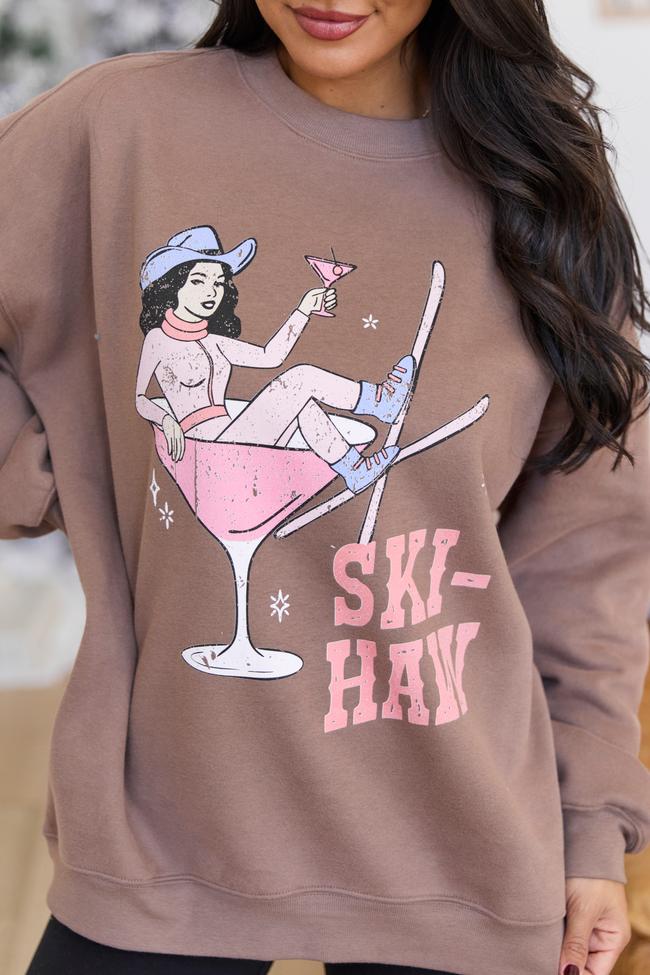 Details Crewneck with martini cow girl design Crew neckline Long sleeves Material and Care Pink Lily Exclusive Sweatshirt 57% Cotton/43% Polyester For best results, wash inside out on a gentle cycle with cold or lukewarm water. Tumble dry low or hang to dry to keep your tee looking fab! Size and Fit Relaxed fit Length: 26"