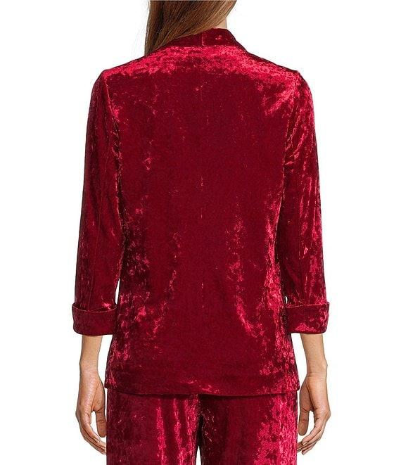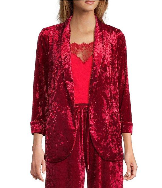 From Skies Are Blue, this top features: Crushed velvet fabrication Open lapel Long sleeves Pull-on construction Contrast lining detail Side pocket detail Approx. 27" Polyester, Spandex Hand wash Imported.