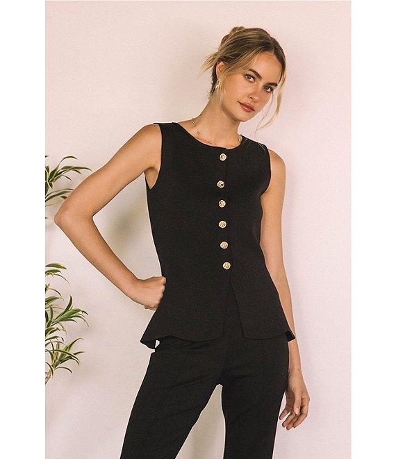 From Skies Are Blue, this vest features: Knit fabrication Crew neckline Sleeveless Button front closure Peplum silhouette Approx. 24" length Polyester/rayon/nylon Hand wash Imported.