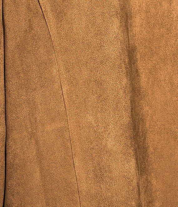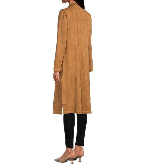 From Skies Are Blue, this jacket features: Faux suede Notch collar neckline Long sleeves Front pockets Open front Approx. 43.75" length Polyester/spandex Hand wash Imported.