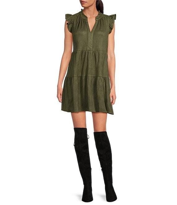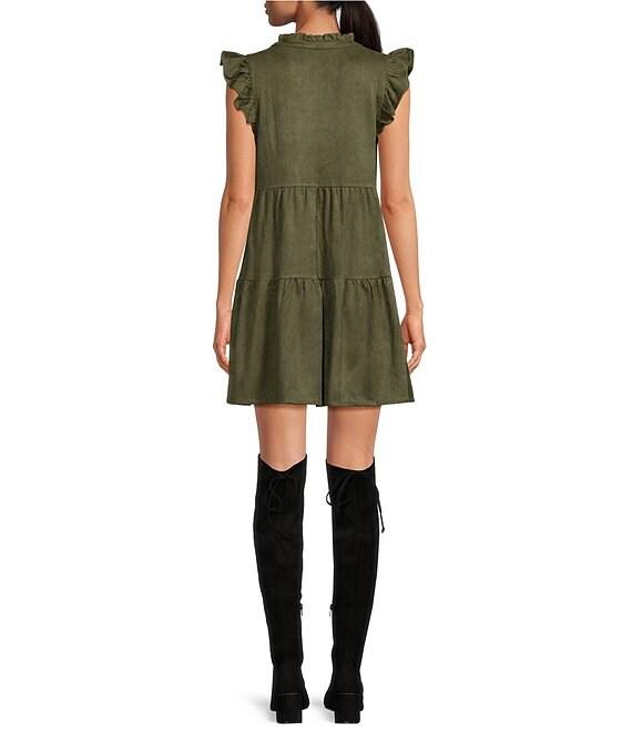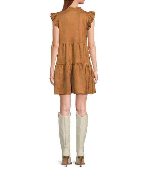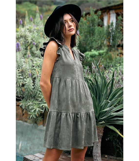 Skies Are Blue Faux Suede Split V-Neck Ruffle Cap Sleeve Tier Dress
