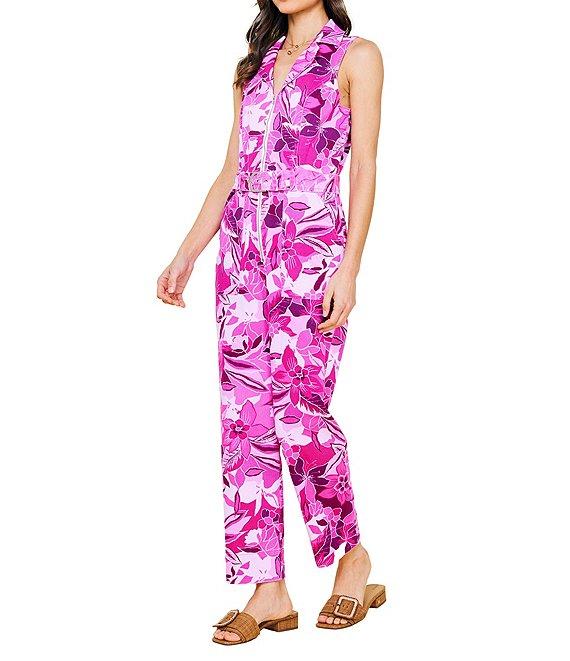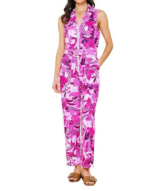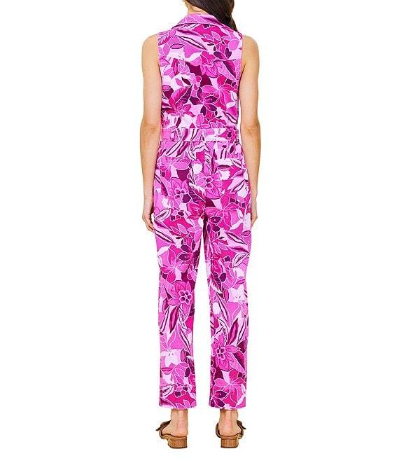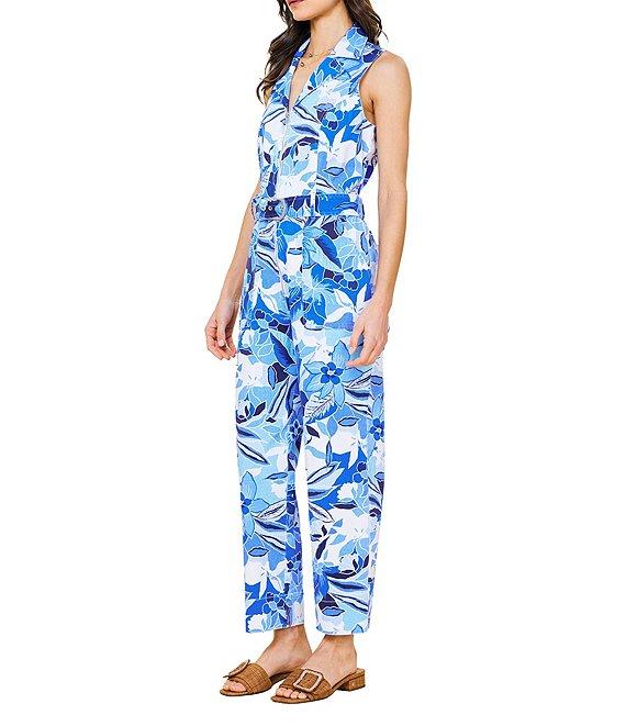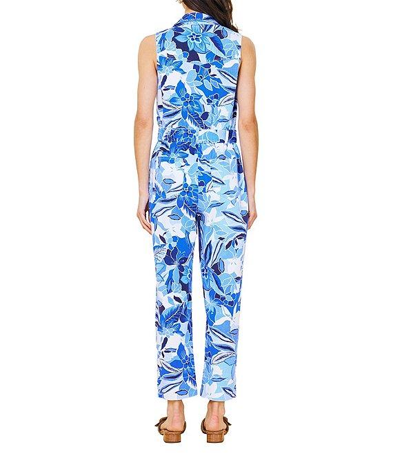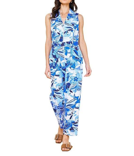 From Skies Are Blue, this jumpsuit features: Twill fabrication Floral print Collar v-neckline Sleeveless Straight leg Adjustable belt Zip front closure Approx. 55 3/8" length; 27" inseam; 8" leg opening Cotton/spandex Machine wash Imported.