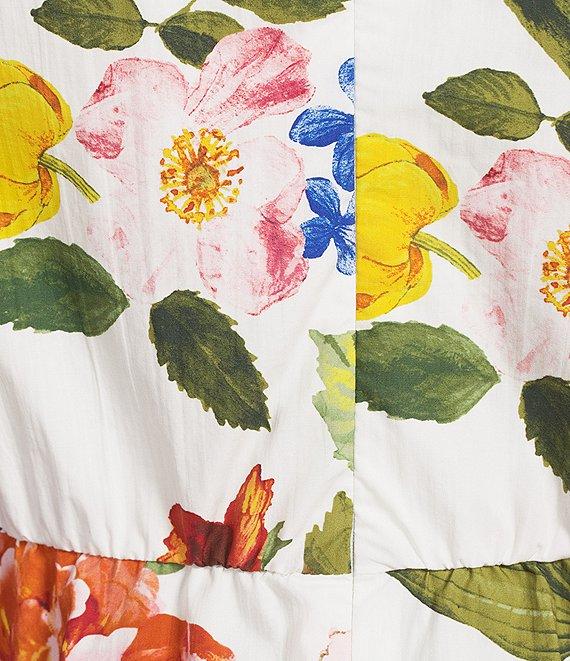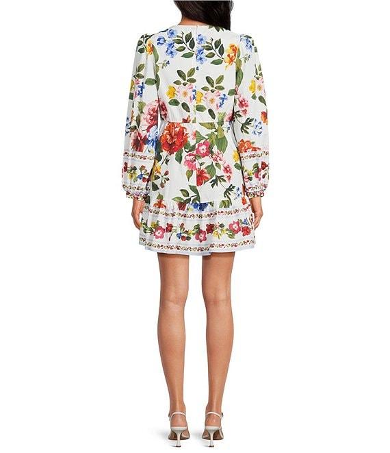 Skies Are Blue Floral Border Printed V-Neck Long Sleeve A-Line Poplin Mini Dress