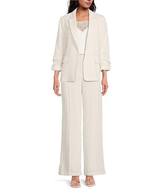 From Skies Are Blue, this blazer features: Linen blend fabrication Notch lapel neckline Open front construction Cinched 3/4 sleeve Functional flap pockets Lined Approx. 27.25" length Self: rayon/polyester/linen Lining: polyester/spandex Hand wash Imported.