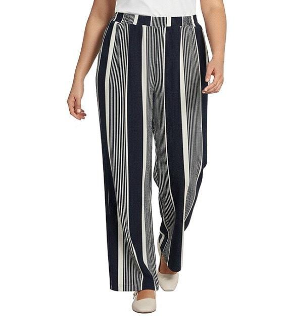 From Skies Are Blue Plus, these pants feature: High rise Variegated-stripe pattern Pull-on styling Drawstring/elastic waist Wide legs Polyester/cotton knit Hand wash/line dry Imported.
